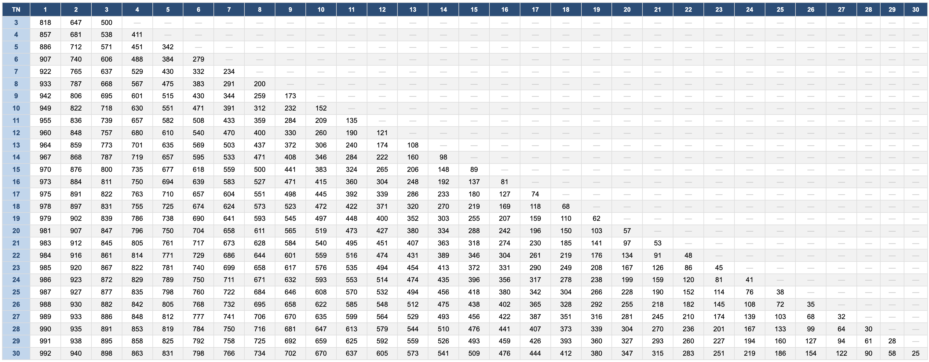 Ehemaliges Punktesystem der Regattavereinigung Seesegeln (RVS) · High-Point-System · TN = Starter, Spalten = Platz