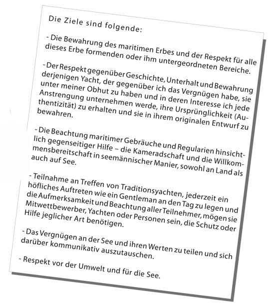 Für Menschen, deren Herzen an ihren klassischen Holzbooten hängen, die ihre z.T. schon sehr alten Lieblinge aus Freude an den Formen, dem Material, dem Segelverhalten usw. bis ins Detail kennen, spielt der Aspekt der Tradition per se eine wichtige Rolle. Stolz werden die Lebensgeschichten der adligen Schönheiten herumerzählt. Respektvoll wird zugehört (sicher, manchmal auch neidisch oder gelangweilt). Wir sind uns dauernd bewusst, dass wir mit etwas Besonderem umgehen. Wir haben Achtung davor. Wir wollen es schützen vor Zerstörung. Wir sind in gebotenem Maße vorsichtig. Wenn ein Skipper seine elegante Schönheit auf dem Meer bewegt, kommt es meist zu einem entscheidenden „Ur-Erlebnis“: Es ist etwas Besonderes, das eigene Schiff dem Verfall entrissen zu haben, es sozusagen reanimiert der Tradition zurückgegeben zu haben. Es ist etwas Besonderes, weil so etwas nicht mehr gebaut wird. Es ist etwas Besonderes mit ihm die Weite und Eindringlichkeit auf dem Meer zu erleben. Es ist ein Vorrecht, das ich genieße, dem ich viele wunderbare Eindrücke verdanke, das mich regelmäßig und immer wieder erhebt, also „adelt“. Gerade deshalb ist der Eigner und Segler einer klassischen Yacht noch am ehesten derjenige, der schon von der Sache selbst her jene Charakterzüge, jenen Stil mitbringen müsste, den sein Schiff und der Umgang damit ihm gebietet: Achtung vor der spezifischen Geschichte (des Bootes, des Bootsbaus, des Yachtsports), Respekt vor den Menschen (dem Erbauer, den ehemaligen Crews, den jetzigen Mitseglern und vor allen anderen, die Ähnliches betreiben), Liebe zum Wasser und zum Wind (denn hierfür ist das Boot gebaut worden), also Liebe zur Natur (Verantwortung für die Umwelt). Deswegen wird die Antwort auf die oben gestellten Fragen bei Ihnen, liebe „Klassiker“, sicherlich rein rhetorisch sein. Wer stilvoll segelt, dem werden die häufig selbst erlittenen Verhaltensweisen fremd sein. Deshalb, so meine ich, gibt es eben nicht nur eine bloße Interessengemeinschaft, einen Verband oder vielleicht gar kein Organ der Klassiker in Deutschland, sondern es gibt den „Freundeskreis“ - ein Begriff, bei dem man vielleicht mal wieder kurz innehalten und ein wenig nachdenken sollte. Ich denke dabei an jene schönen Bilder vor der Hafenzeile in Sonderborg bei der Classic week 2006. In der Abendsonne hatten alle Teilnehmer, von der Jolle bis zum Zwölfer, ihren Platz im Päckchen gefunden. Helping hands jede Menge! Die Cockpits waren noch lange voll. So manches Gespräch wollte gar nicht enden. Kein Gegröhle oder sonstiger Unsinn. Die adligen Schönheiten waren, im Wasser wippend, schon zur Ruhe gegangen. Und man weiß ja: noblesse oblige- Adel verpflichtet.