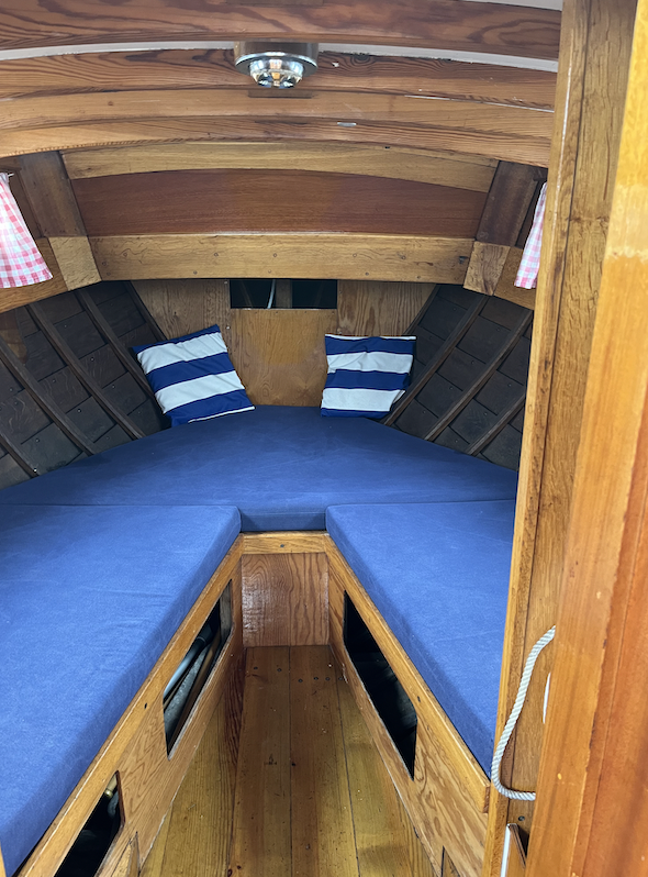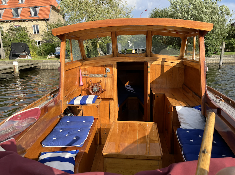 Mahagoni, das Deck ist aus Teak. Angetrieben wird das Boot