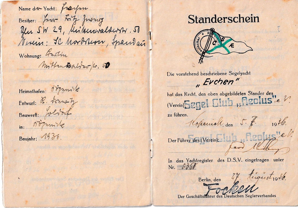 Die Jolle mit eine Länge von 6,45m und der Breite von 2,06m wurde 1936 in Berlin Köpenick von der Werft Goldorf gebaut und hat viele schöne Jahre auf dem Wasser verbracht, was im Original-Ausweisheft des Deutschen Seglerverbandes dokumentiert ist.