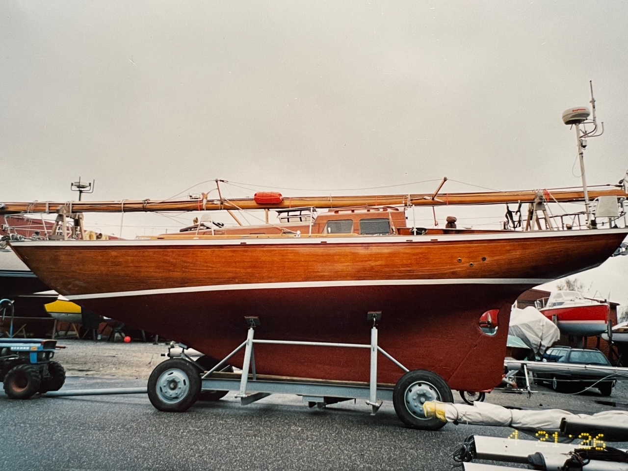 Mahagonie-Natur inkl. Rumpf, Kompositbauweise, Hatecke, Freiburg und Asmus in Glückstadt. 12 m x 3m x 1,95, DECK neu in 2000, 8/20mm Sperrholz/Teak verklebt und verschraubt. KIELBOLZEN (1.4571) neu und Umfeld grundüberholt 2005. Gewicht ca. 10 tons. Neu 2007: Antriebsanlage Yanmar 40 PS-Diesel 3JH4E mit 4-flügl. SPW-Drehprop-Lattengroßsegel mit Lazyjags. Großer solider Bootswagen. Niro-Diesel- und Wassertanks, Lavac-WC, 2008 Domestic-Kocher 220V +Spiritus, Eberspächer Heizung, Pött un Pann. viel Werkzeug, Kompressor-Kühlbox neu, Handpeil- und Steuerkompaß. 2 GPS und Teldix-Plotter, Meteograf. Yaesu-Kommunikationsempfänger, UKW-Funkgerät neu, 3 Batterien, 2012 neues Ladegerät, 2 Solarpanells, Seekarten Ost- und Nordsee plus Norwegen. Mast Spruce, Harken-Rollanlage, SW-Anlage 2007 neues Groß, 4 neuere Vorsegel, neuer Blister. 2 Anker mit Kette bzw. Vorlauf und Gurtrolle, elektr. Ankerwinsch, reichlich Leinen, Fender Persennige, Schlauchboot, 4 PS Mariner Secumar Rettungsinsel 4 Pers. Lifebelts. Decksgurte. Automaticschwimmwesten. Rettungswesten, Leuchtpistole. Autohelm-Autopilot, Birdell Radarreflektor, Raytheon Pathfinder Radar auf Heckmast Achterstagantenne mit Balun.