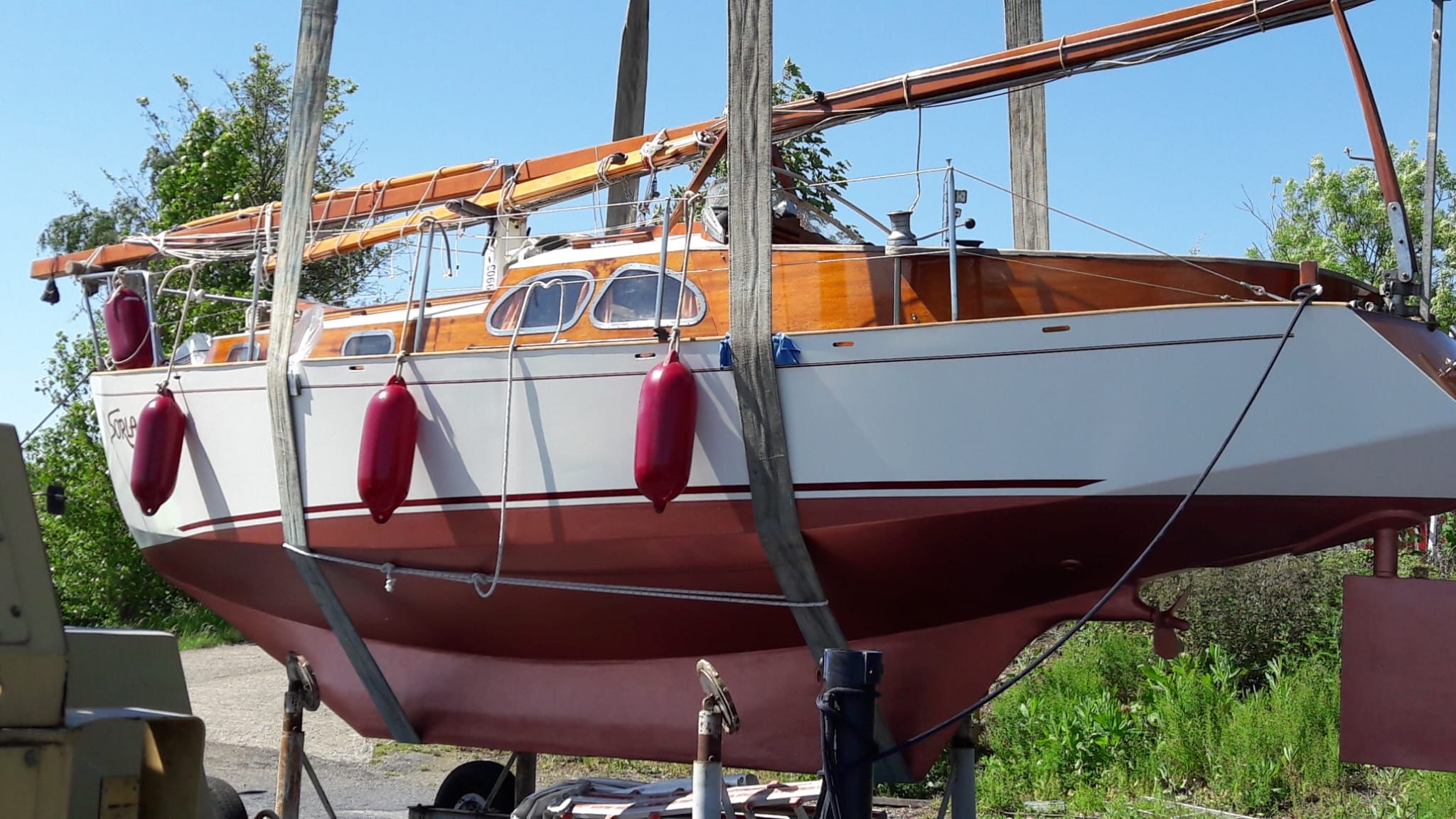 Das Unterwasserschiff wurde 2020 komplett neu aufgebaut und 5-fach mit einem 2-Komponenten Epoxidharzprimer lackiert. Die Aufbauten werden regelmäßig mit Lacköl und Weißlack behandelt. Das Schiff war im Winter immer in der Halle oder unter einer Abdeckplane auf dem Trailer. Im Sommer schützt eine Ganzpersenning vor Witterungseinflüssen und reduziert den Pflege-Aufwand deutlich :-))