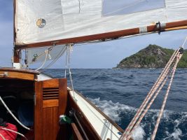 In manchen Revieren segeln Klassiker-Enthusiasten im gesamten Jahr - Freundeskreisler Peter König mit der Hansajolle +94 TRUE LOVE grüßt auf 4 Grad Süd von den Seychellen.