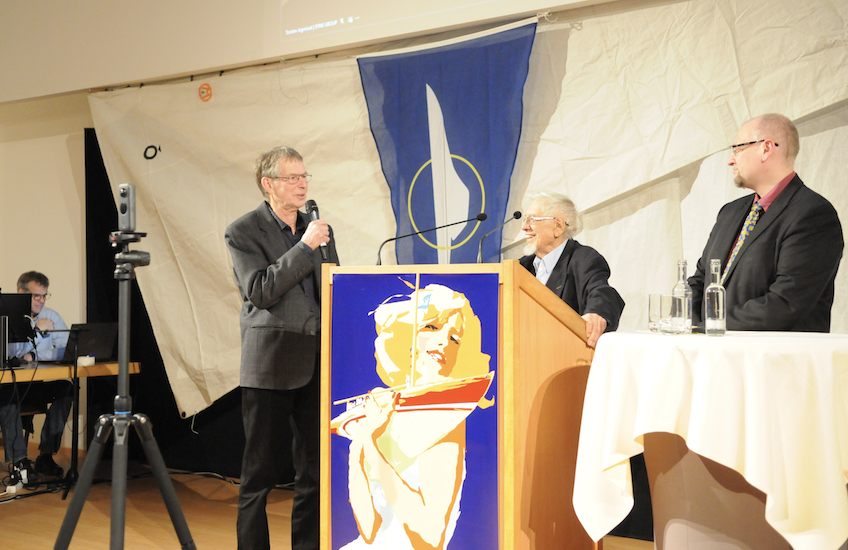 Der erste Themenblock „Konstruktionswissen“ befasste sich speziell mit der Entwicklung unserer schönen Yachten. Unser Referent Prof. H. D. Scharping hat die Szene seit Jahrzehnten beobachtet und gestaltet, als Bootsbauer, Yachtkonstrukteur und Professor für Yachtbau an der Hochschule für Technik in Bremen. Sein Vortrag begann mit einer Auswahl an historischen Büchern und streifte kurz die Geschichte von Frachtseglern bis zu wirklichen Yachten, u. a. durch die Entwicklung der Kiele und außen liegendem Ballast. Sodann kommentierte Herr Scharping ausgesuchte Entwürfe der bekanntesten Werften insbesondere an der Weser wie A&R, Lürssen und Burmester, den Konstrukteur Gruber und dessen Bedeutung für das Seesegeln. Breiten Raum nahm die Darstellung ein, wie eine Yacht am Reißbrett entsteht, vom Liniennetz zum Linienriss, die Gewichtsrechnung, Form- und Gewichtsschwerpunkt. Deutlich wurde, welche Anforderungen an die Stabilität zu stellen sind und wie eine Yacht bei Krängung vertrimmt und dem Steuermann das Ruder aus der Hand reißt. Zahlreiche Hinweise auf bauliche Ausführungen wurden gegeben. Herr Scharping hat bemerkenswerter Weise rein aus dem Gedächtnis heraus vorgetragen, neben ihm stehend unterstützte ihn sein Enkel Göran Scharping, Schiffbauingenieur bei A & R, mit Folien zu den einzelnen Aspekten.