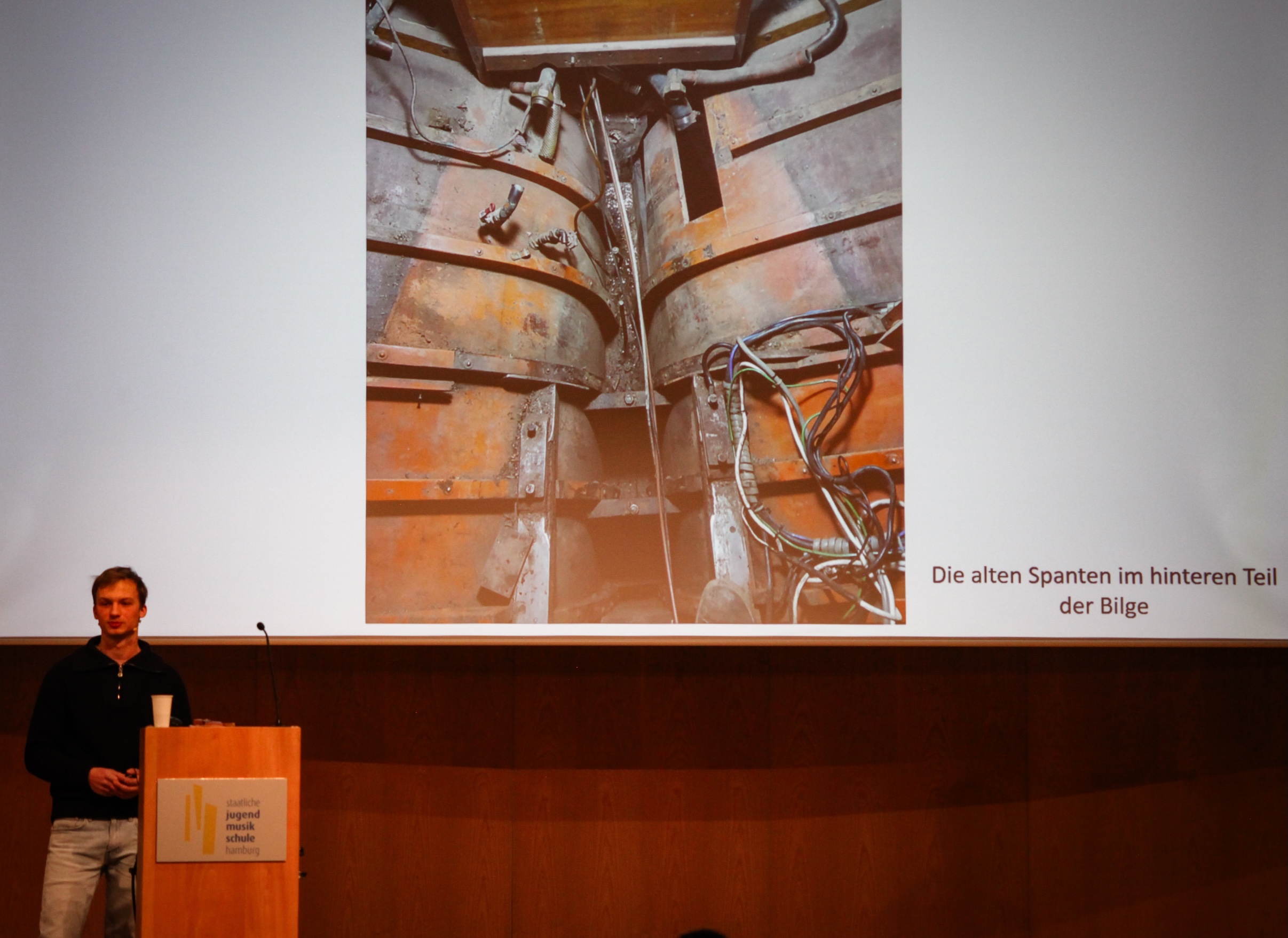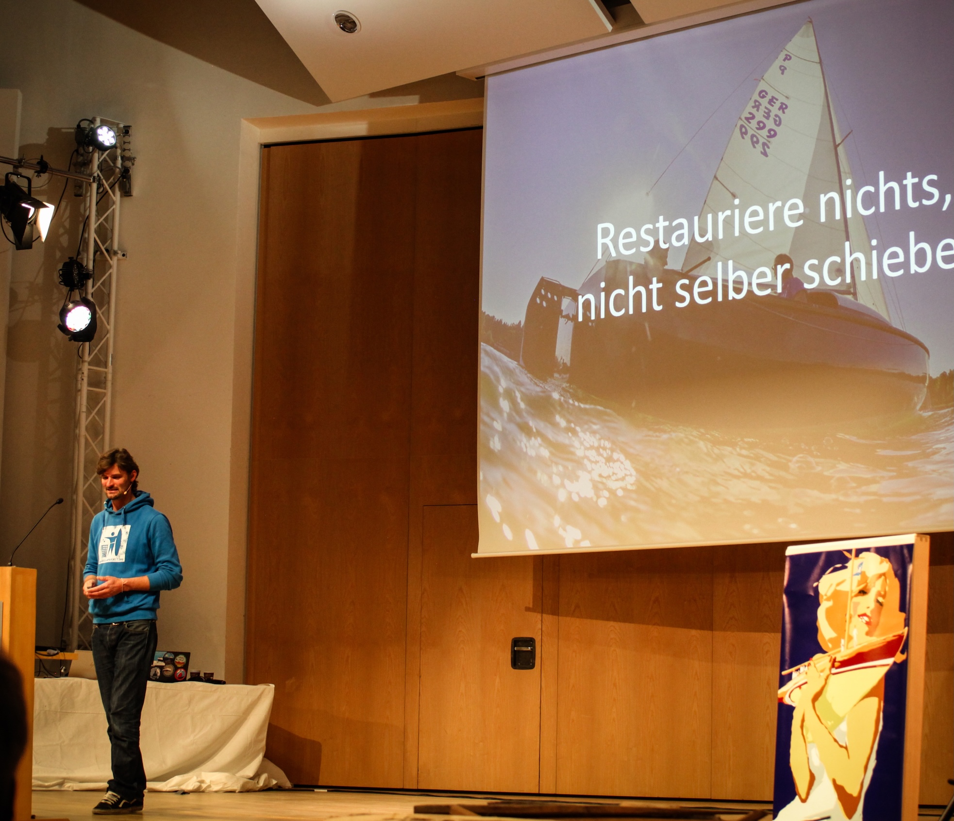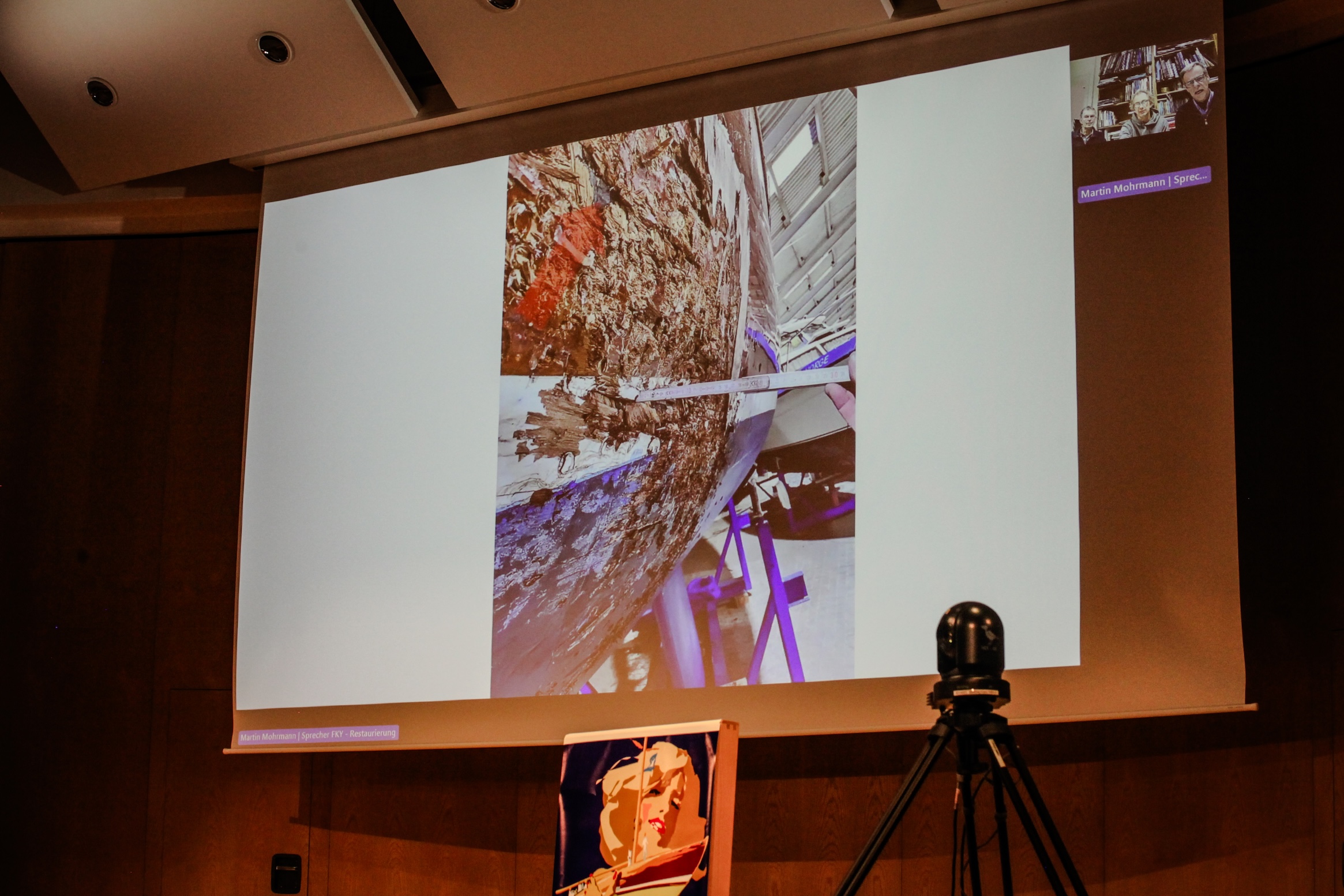 Den krönenden Abschluss des Symposiums bildete der begeisterte Bericht von Felix Dudek aus Flintsbach. Der süddeutsche Segelbegeisterte repariert und restauriert seit seiner Jugend Jollen und Jollenkreuzer. Unter dem prägnanten Titel "Restauriere nur, was du von Hand schieben kannst!" führte er uns mit aussagekräftigen Bildern in seine Werkstatt, berichtete von Erfolgen und Rückschlägen bei den Arbeiten an einem 15er-Jollenkreuzer und einer fast 100-jährigen M–Jolle (15qm Rennjolle).