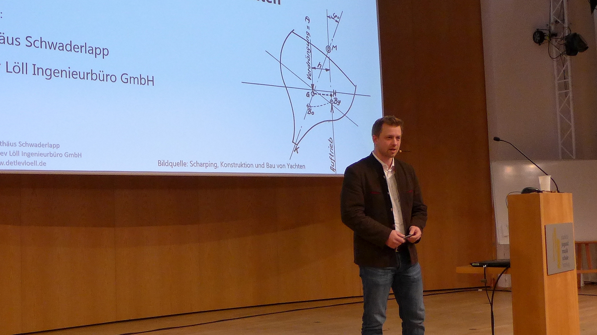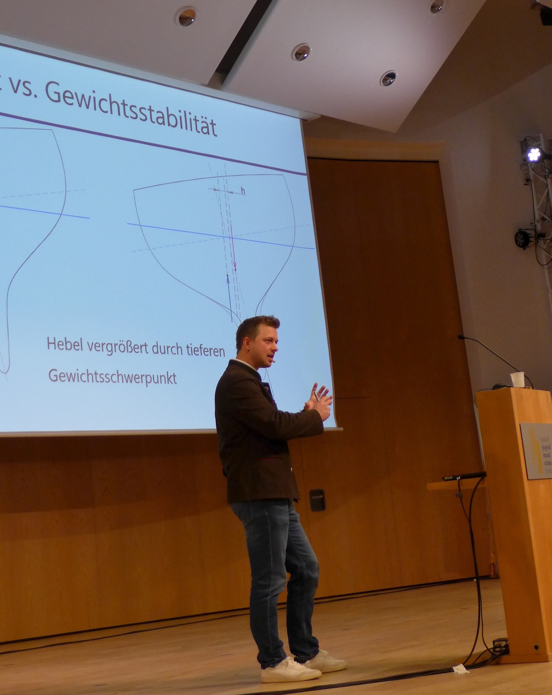 Nun ging es um das Zusammenspiel zwischen Gewichtsstabilität und Formstabilität, und wir hatten das große Glück, dass Matthäus Schwaderlapp, der Geschäftsführer der Detlev Löll Ingenieurbüro GmbH, der auch gelernte Bootsbauer und Schiffbauingenieur ist, für uns referierte. Nach einführenden Folien zur Lage von Gewichts- und Auftriebsschwerpunkt zeigte er typische Hebelarmkurven für das Aufrichtende Moment. Wir sahen, dass auch Kielyachten kentern können, die einen früher, die anderen später. Die Frage, die sich uns allen stellte, war, was besser ist: breit und leicht oder schmal und schwer? Oder vielleicht sogar eine Kombination aus beidem?