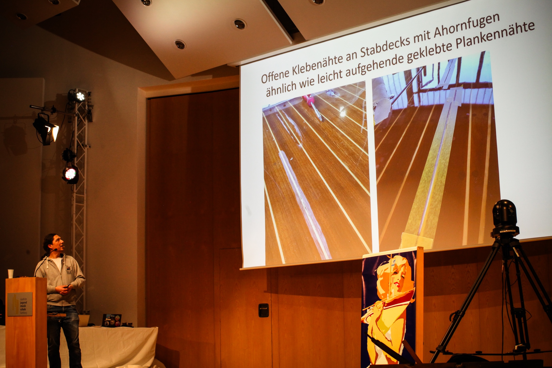 Nach der Mittagspause ging es dann zum umfangreichen Thema Verklebungen – Klebstoffe und Leime. Den Hintergrund dieses Themas bilden insbesondere die Verklebungen aus den 60er bis 70er Jahren, also die aufgehenden Plankennähte, Spanten, Masten und Sperrhölzer aus der Zeit. Helge von der Linden gab einen Überblick zu den verschiedenen Stoffen wie Harnstoff-Formaldehyd-Leime, Phenol-Resorcinharzleime, Weißleime, Epoxydharze sowie PU-Leime und erläuterte ihre Eigenschaften im Hinblick auf Verarbeitung und mögliches Versagen.