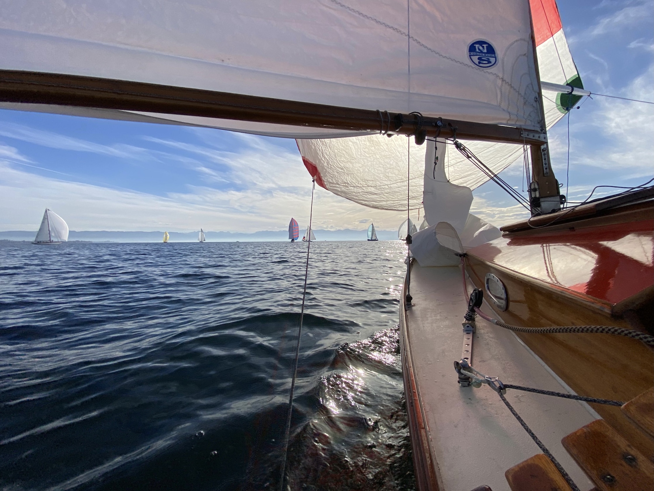 Titelfoto von Carl Haufe: Hansajolle MALOJA unter Spinnaker im November auf dem Bodensee