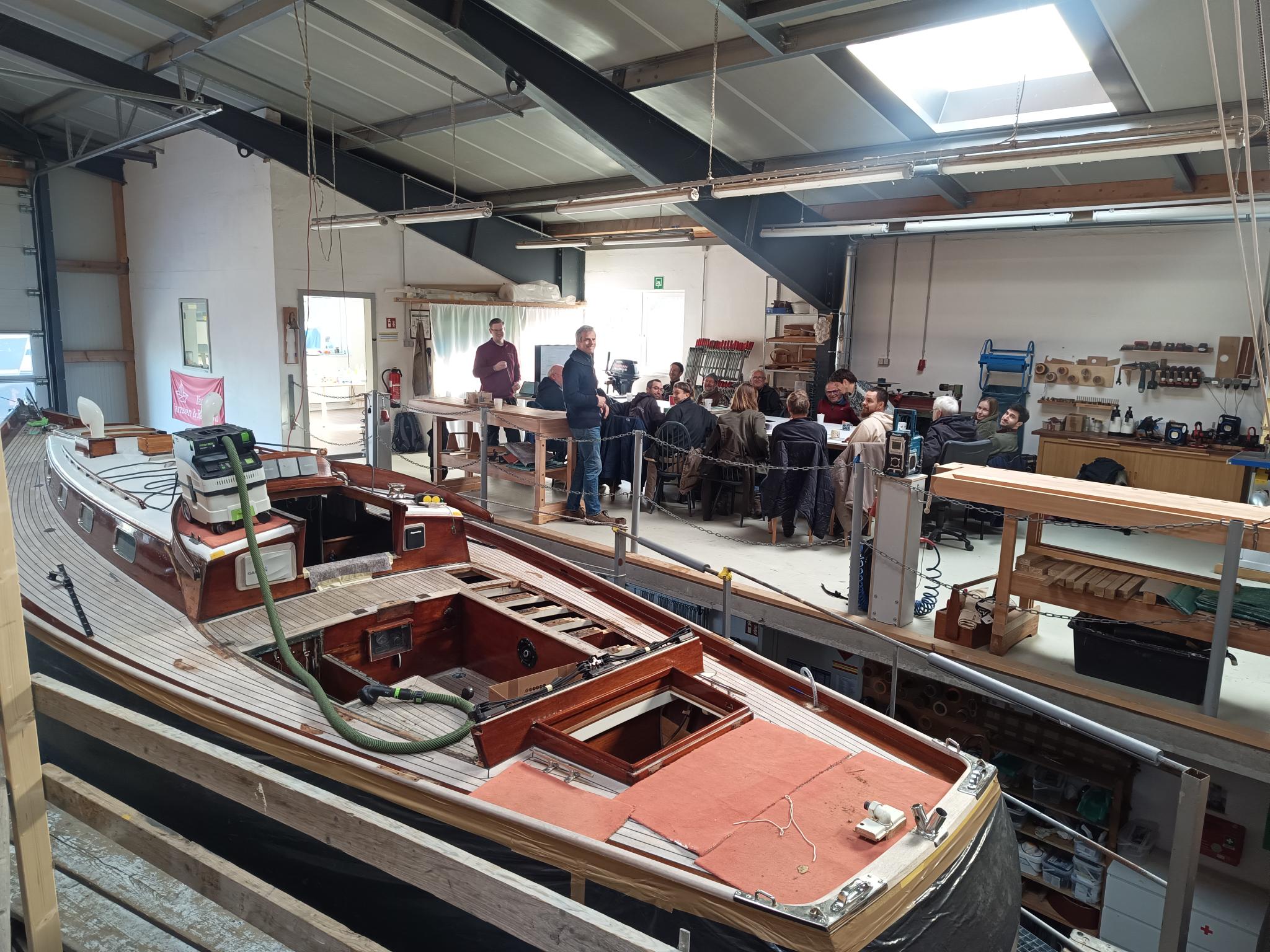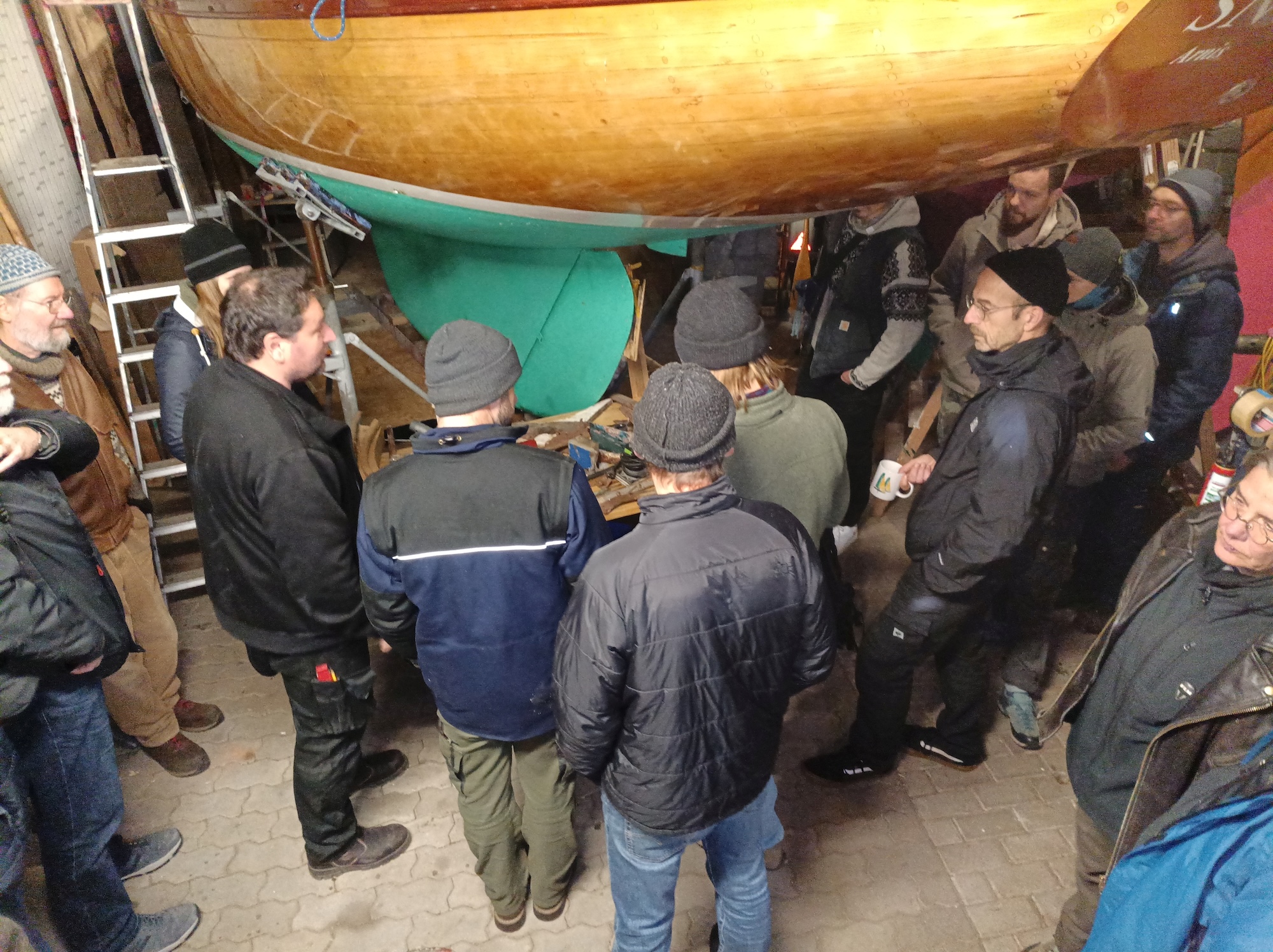 Für den zweite Part des Restaurierungsseminar fuhren die Teilnehmer zur Bootshalle in Grödersby. Hier ging es praxisnah weiter, weil in der Halle fast jede Art von Klassiker im Winterlager stand. Niels Engel konnte zu jedem Boot und Yacht die Historie und vollzogene Instandhaltungsarbeiten berichten und viele Teilnehmerfragen beantworten.