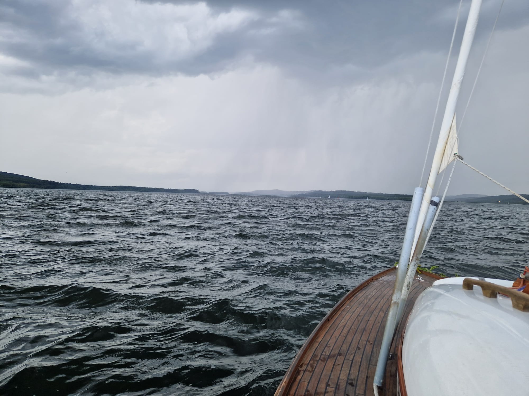 Am Samstag folgte der Klassik Trichter: 6h Langstrecke, Brombachsee linksherum. Start um 1200h bei Kaiserwetter mit 3 Bft. Wind zunächst aus SW mit einigen tricky Winddrehern. Für den Nachmittag war für ein bis zwei Stunden stärkerer Wind angekündigt, doch was nach dem ersten Donner geschah, hat der Berichterstatter auf einem Binnengewässer so noch nicht gesehen. Der Wind drehte auf West, nahm mit Grundgeschwindigkeit auf 5-6 Bft zu und zwei aufeinander folgende Gewitter trieben Regen und Böen mit - laut DWD - bis zu 32 kn über den See. Wilfried Erdmann nannte das in seinen Büchern einen Jollensturm. Mit dem zunehmend schweren Seegang und den erheblichen Sichteinschränkungen schalteten die Crews in den Überlebensmodus. Die Hälfte der Flotte brach ab, die andere Hälfte machte weiter. Haben diejenigen, die draußen geblieben sind, gezeigt, was für tolle Segler sie sind oder diejenigen, die reinfuhren, dass sie vernünftig sind? Das Wichtigste ist: Nur sehr geringe Schäden an den Schiffen, nur eine Kenterung einer Jolle, aber v.a. keine Verletzungen.