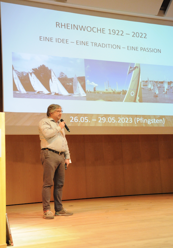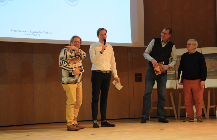 Den Beginn machte Bernd Deertz vom Yacht Club Niederrhein. Er führte das Publikum durch einhundert Jahre Rheinwoche, der längsten, ältesten und größten Flußregatta Europas, die er zusammen mit Helge von der Linden organisiert. Nicht wirklich viele Klassiker, aber immerhin ein L-Boot (Sonderklasse) war dabei und gewonnen hat im letzten Jahr eine formverleimte Holz H-Jolle. Dazu passte dann die Vergabe der Messlatte für die beste Mannschaft auf Binnen-Revieren durch Steffen Tiemann und Torsten Jegminat. Nur schade, dass keiner der Preisträger anwesend war.