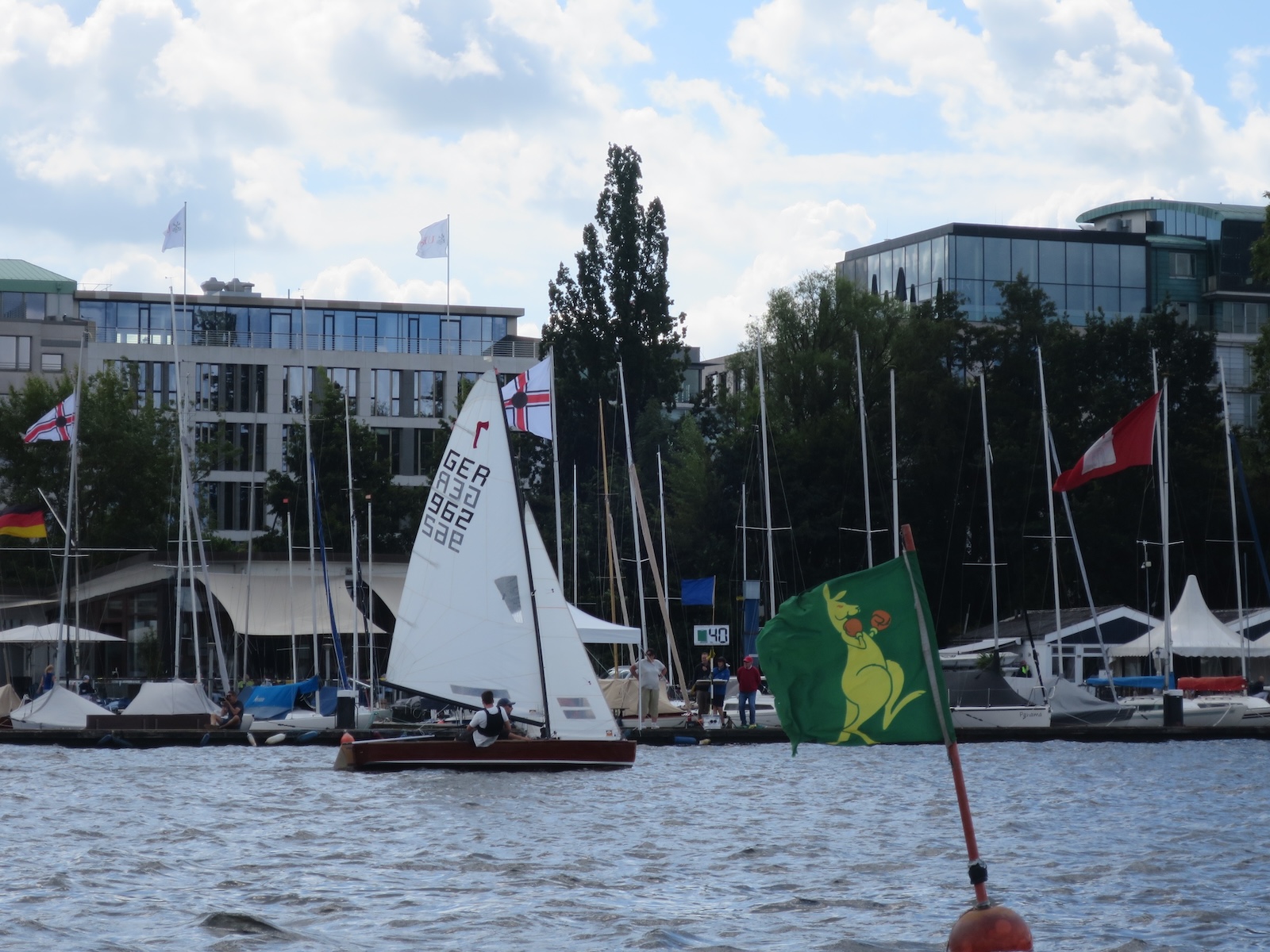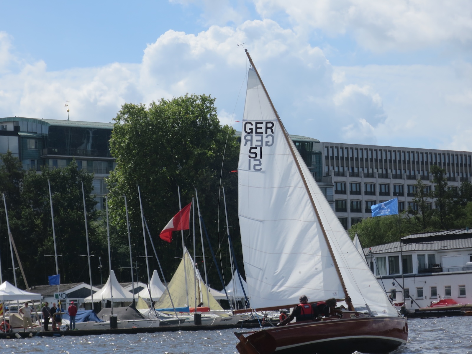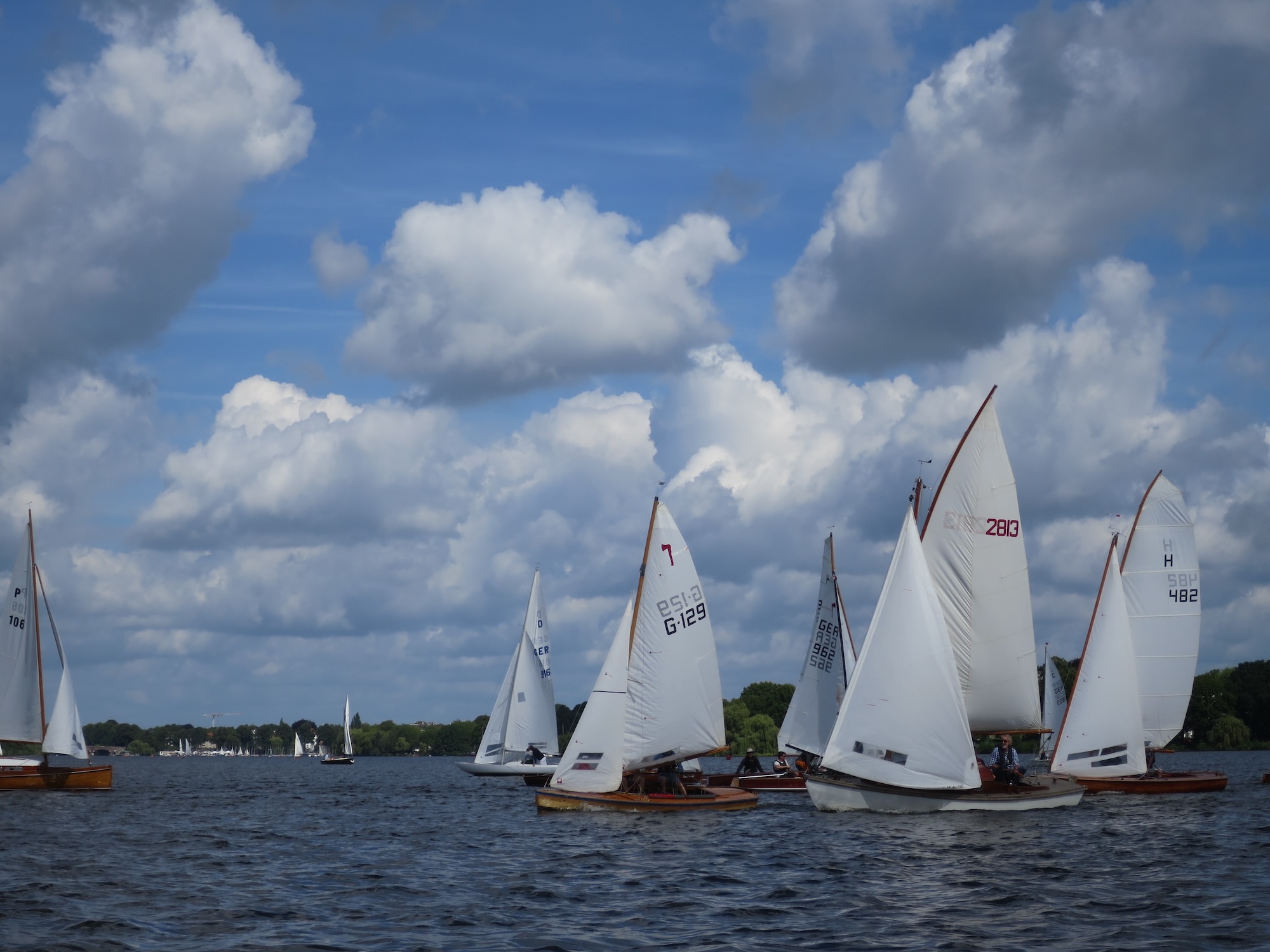 Das Wetter spielte mit und wenn auch ein paar graue Wolken über die Alster zogen, die meiste Zeit schien die Sonne. Der Wind um 3-4 Bft. mit 6er Drückern stellte keine zu hohen Ansprüche an die Seglerinnnen und Segler und das Wettfahrtteam um Johann-Nikolaus Andreae konnte problemlos 2 Wettfahrten am Sonnabend und 2 am Sonntag durchziehen. Am Samstag war um 16 Uhr Schluss und um 17 Uhr hatte George und sein Team vom Gurlitt Restaurant ein Grillbuffet vom Feinsten auf der Terrasse aufgebaut, der Chef selbst stand am Grill. Am Abend wurde in kleiner Runde geschwoft, doch das Seglervolk war müde und der Abend trotz lauer Temperaturen kurz. Eigentlich schade, denn was kann es schöneres geben als inmitten wundervoller Holzschiffe und vor Hamburger Kulisse einen schönen Abend im Kreise der Seglerfreunde zu genießen.
