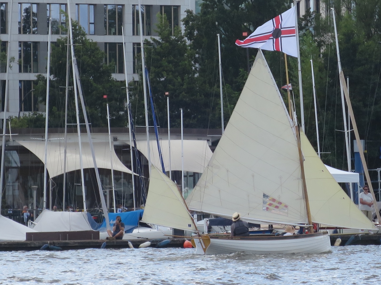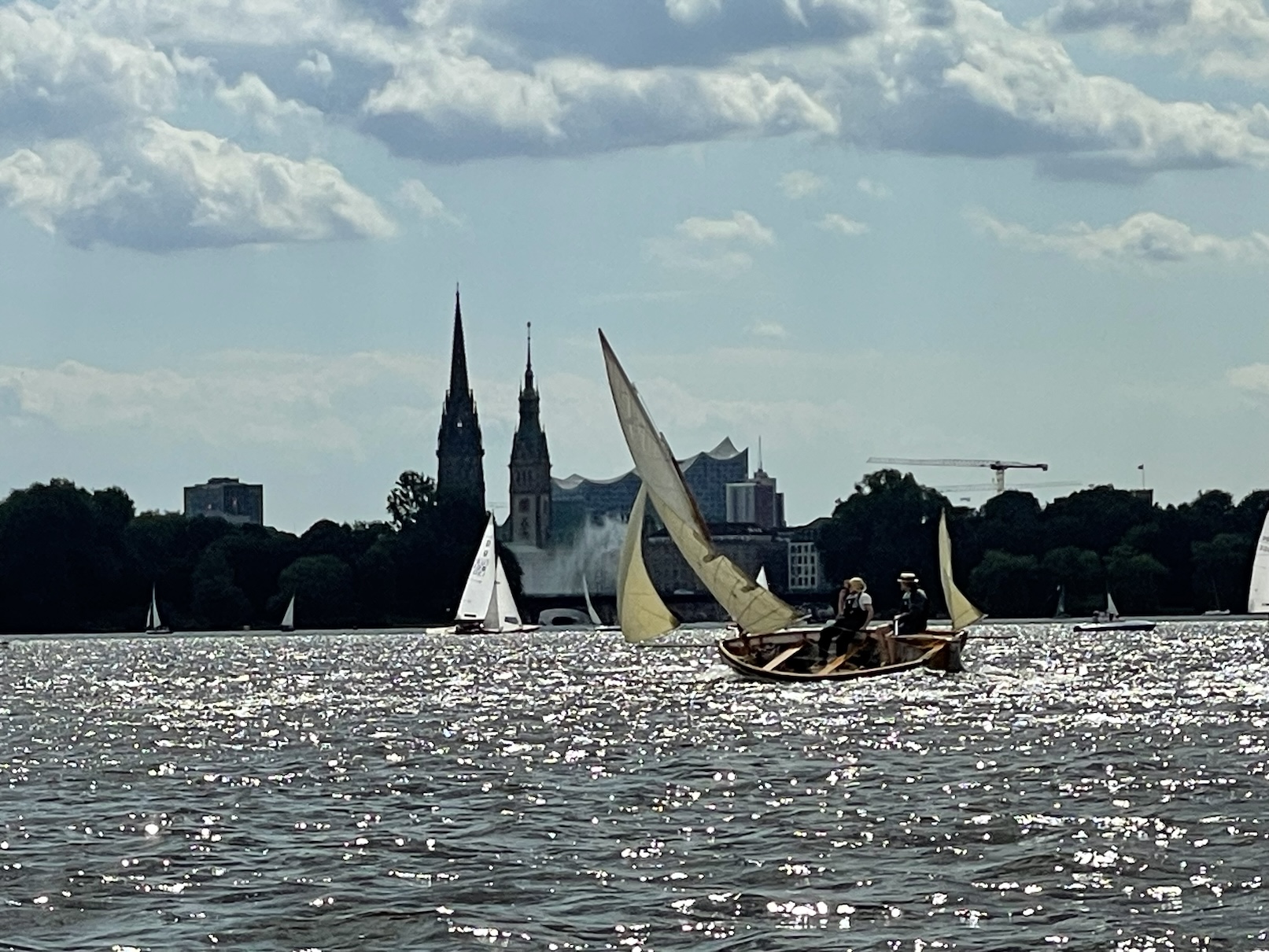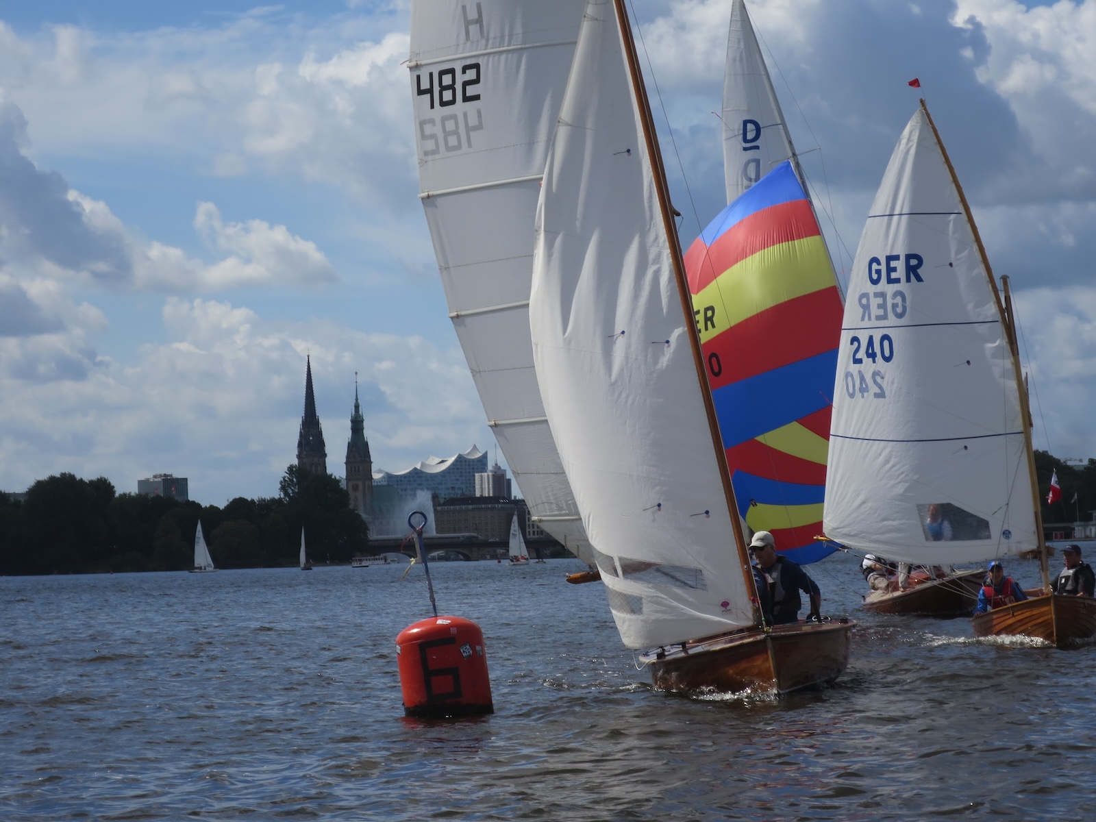Das Wetter spielte mit und wenn auch ein paar graue Wolken über die Alster zogen, die meiste Zeit schien die Sonne. Der Wind um 3-4 Bft. mit 6er Drückern stellte keine zu hohen Ansprüche an die Seglerinnnen und Segler und das Wettfahrtteam um Johann-Nikolaus Andreae konnte problemlos 2 Wettfahrten am Sonnabend und 2 am Sonntag durchziehen. Am Samstag war um 16 Uhr Schluss und um 17 Uhr hatte George und sein Team vom Gurlitt Restaurant ein Grillbuffet vom Feinsten auf der Terrasse aufgebaut, der Chef selbst stand am Grill. Am Abend wurde in kleiner Runde geschwoft, doch das Seglervolk war müde und der Abend trotz lauer Temperaturen kurz. Eigentlich schade, denn was kann es schöneres geben als inmitten wundervoller Holzschiffe und vor Hamburger Kulisse einen schönen Abend im Kreise der Seglerfreunde zu genießen.