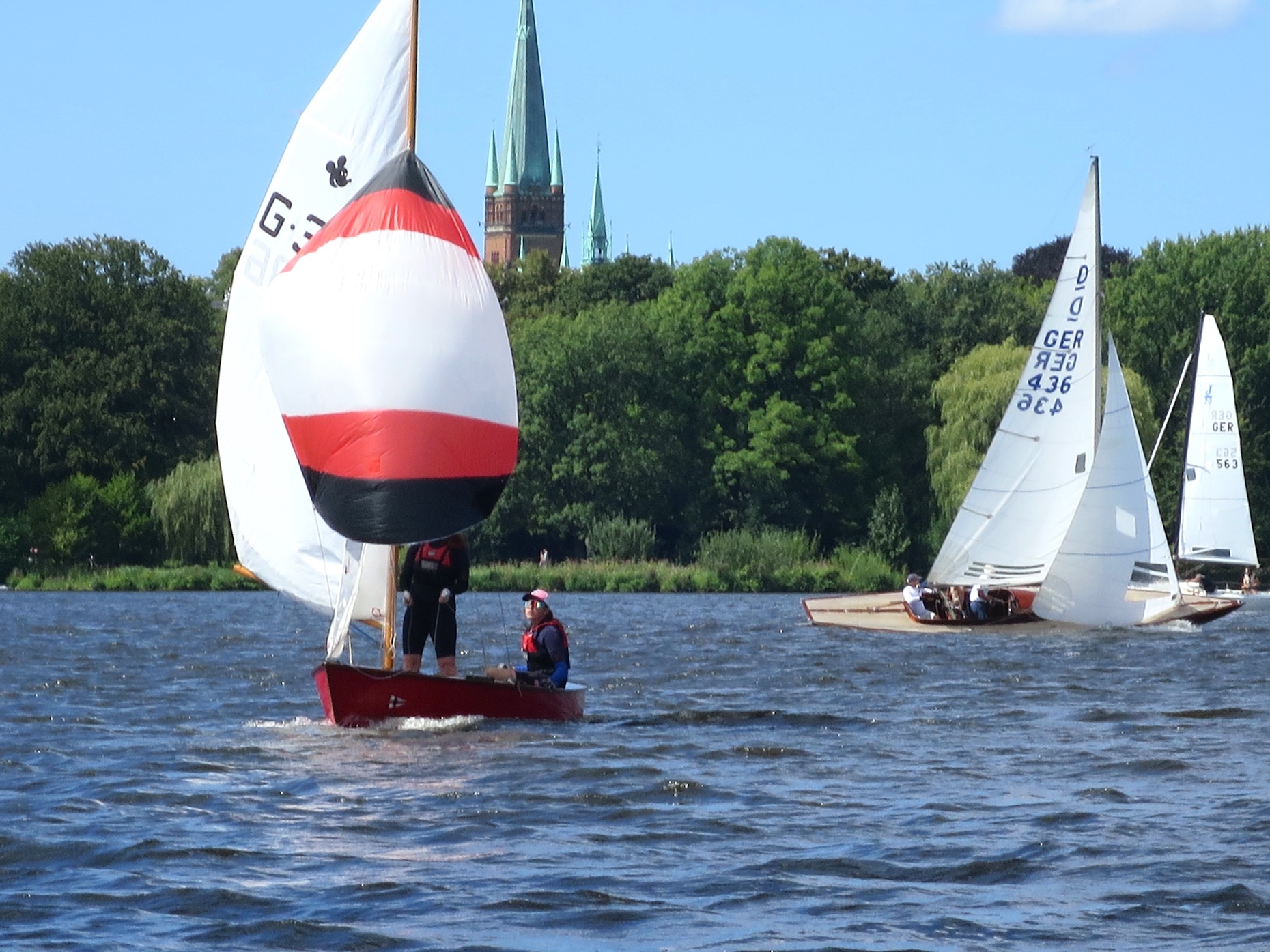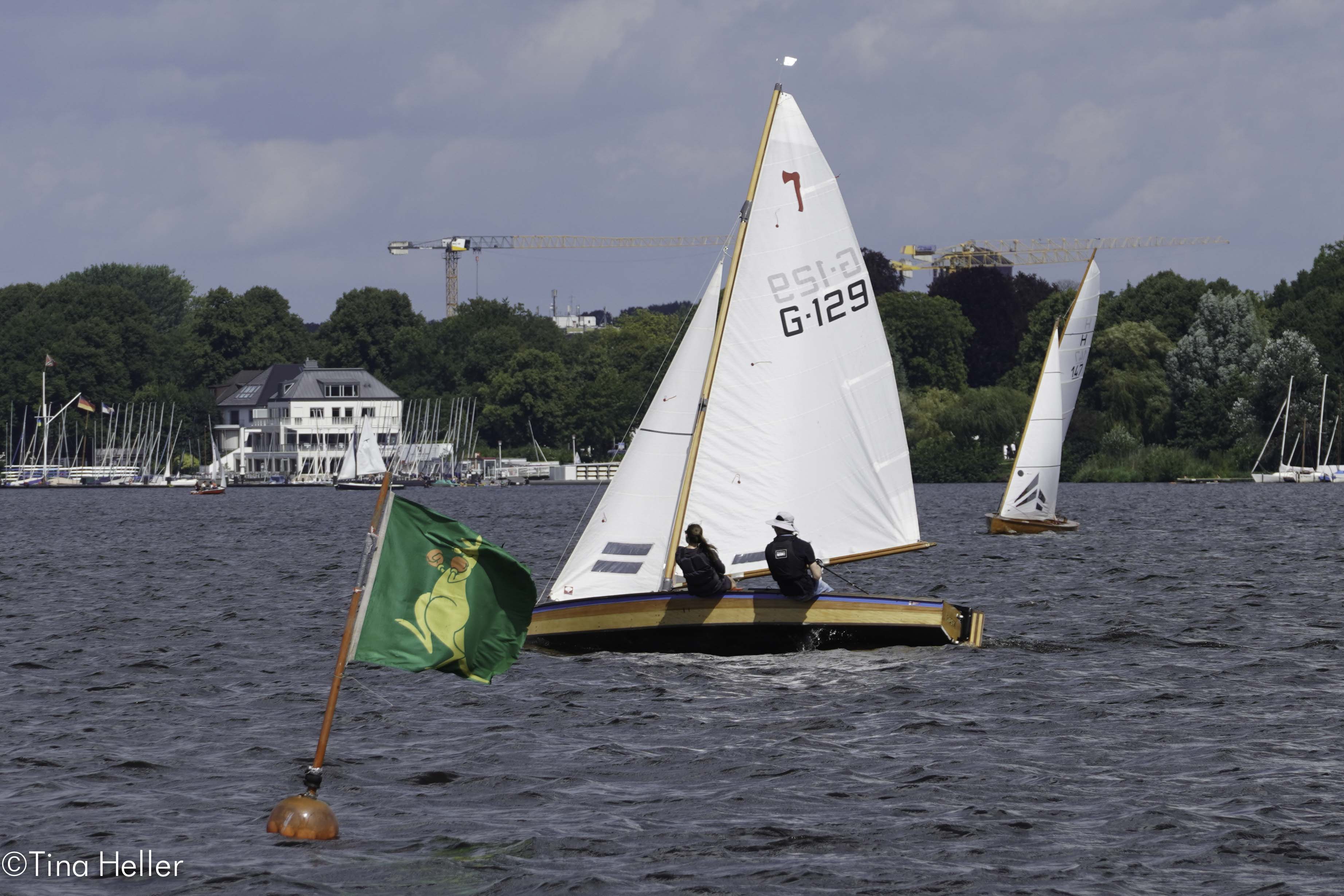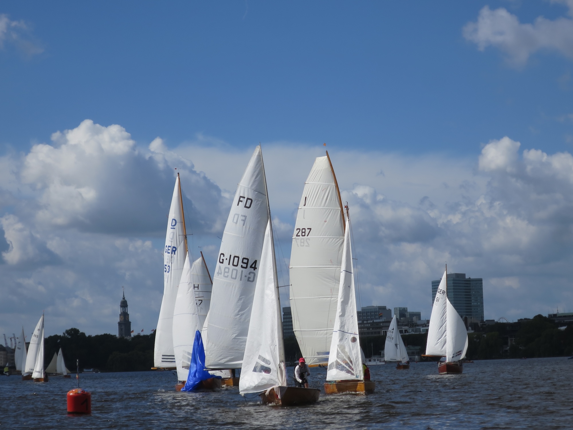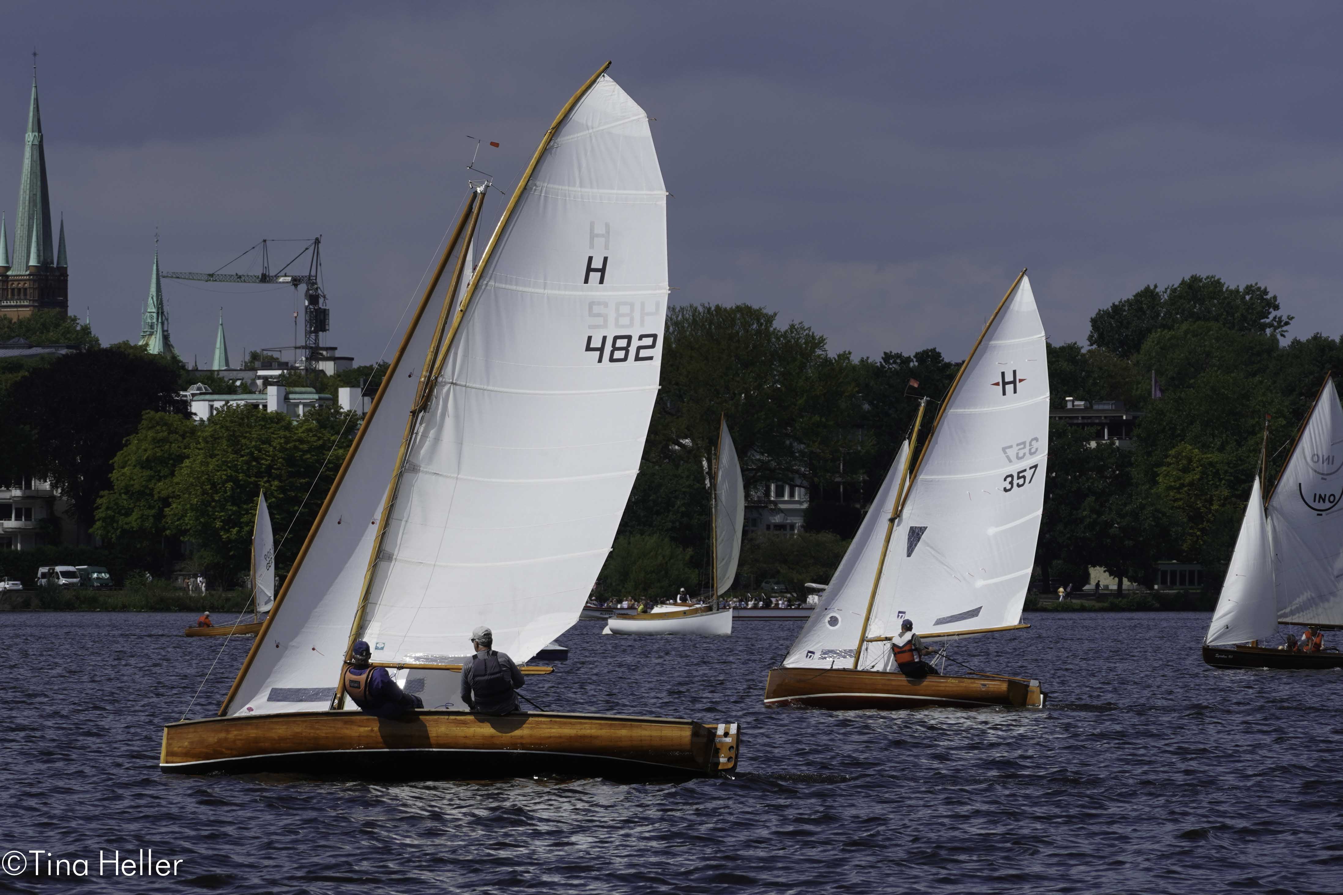 Das war bei beiden Unglücklichen der Fall. Die Boote, Fram die I-Jolle von Manfred Jacob (feierte gerade ihren 100. Geburtstag und sieht aus wie aus dem Ei gepellt, was mit einem Fass Freibier vom Eigner zelebriert wurde) und Herta 2, die Berliner H-Jolle von Axel Heller (89 Jahre jung – das Schiff und genauso hübsch) sind beide voll regattafähig ausgerüstet und werden sehr gut gesegelt. Wie kam es trotzdem zur Kenterung? Einmal war es ein ausgerauschter Spi-Achterholer auf spitzem halben Winds-Kurs und einmal eine missglückte Halse. In beiden Fällen kamen die Drücker und Winddreher im falschen Augenblick. Die Alster forderte ihre Opfer, das passiert auch Profis.