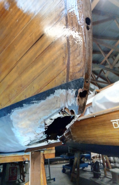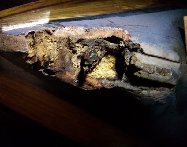 Mit Peter hatte ich in der vergangenen Saison eine rotte Stelle am Spiegel repariert. Dabei hatte er mir gegen den Rat der „Epoxy-Fraktion“ zu einem Stück Holz empfohlen, das eingebaut werden sollte, „und fffertig!“. So haben wir es dann auch gemacht, auch wenn es so einfach nicht ging, wie anfangs geplant. Jetzt war das „Projekt“ um ein Vielfaches größer, schwieriger. Wir einigten uns auf die Zusammenarbeit und noch am selben Tage legte ich los. Ausbauen, das bedeutete verrostete Nägel rausziehen oder abschleifen, das Stevenknie ausbauen, wobei die Bronzebolzen doch recht gut rausgeschlagen werden konnten, und wie sich dann zeigte, auch die erste Wrange, die schon angegammelt war, rausnehmen, wobei die Kupfernieten letztlich auch gut rausgingen.