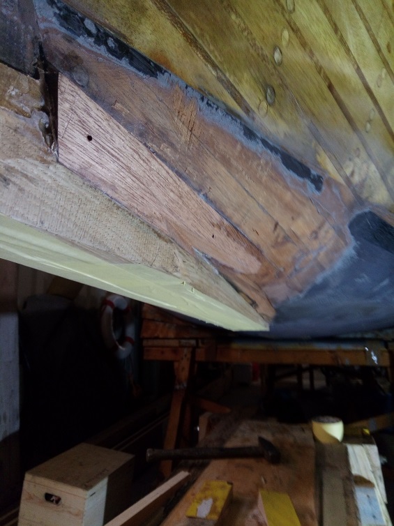 Ich hatte dafür auch einen der heiß begehrten (und auch immer heiß umstrittenen) Plätze in der Halle des Vereins bekommen. Am 12. November 2019 begann ich mit dem Abziehen des Decks. Natürlich kamen dabei neue Schäden zum Vorschein, kleinere und größere. Nach dem Abziehen ging es an die schwarzen Pfropfen, auch da waren es am Schluss mehr als vorher gesehen. Aber es lief, planmäßig. Ungeplant, aber willkommen, war die Unterstützung von Segelfreunden: von Uli Krienke beim Ausfräßen des Risses, wobei auch da ein zweiter, kleiner Riss hinzukam; von Steffen Zander bei der Reparatur eines Decksbalken und natürlich immer wieder, mit kritischen, aber stets konstruktiven Hinweisen von Hans-Peter Jakubowski, zur Unterscheidung zu anderen „Peters“ im Verein auch als „Raucher-Peter“ benannt und bekannt. Vor allem die Decksbalken wurden (unplanmäßig) zum Problem, auf beiden Seiten in der Mitte des Decks, wo ich mit Epoxy herumgeschmiert hatte. Der Effekt des immer wieder auf Schleichwegen eindringenden Wassers war eindrucksvoll – verrottete und morsche Balken. Die Konsequenz: weitläufig aussägen und neues Holz einsetzen und neue Decksbalken. Dass dies immer wieder zu neuen (ungeplanten) Herausforderungen führte, sei nur am Rande erwähnt. Nach vier Wochen täglicher Arbeit im „Arsenal“ waren die Holzschäden repariert und alle schadhaften, sprich schwarzen Pfropfen ausgewechselt. („Arsenal“ in Anspielung an die große Werft in Venedig, in der im Mittelalter die damals größte Kriegs- und Handelsflotte gebaut und auch repariert wurde. Im Jahre 1570 baute man in 50 Tagen 100 Kriegsgaleeren. Und die arsenalottis, die hoch geachteten Bauleute im Arsenal, bekamen neben guten Lohn 500 Liter Wein im Jahr. Halt Protokollant. jetzt keine Venedig-Vorlesung!)