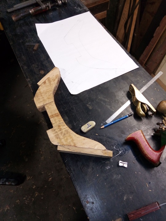 Doppelungen der Wrange an der Vorderseite/Hinterseite plan gehobelt. Die Rumpfkontur im Bereich der Wrange mittels Konturschablone abgenommen und auf die Wrange übertragen