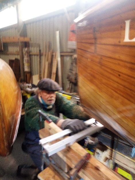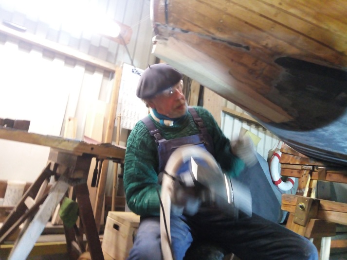 Nun ging es jeweils wieder an unsere geplanten Baustellen: Hans-Peter zu seiner „Donnerwetter“, ein 20er Jollenkreuzer, dem er gerade die alte Kielbohle entnahm. Wahrlich ein Großprojekt der besonderen Art, das ebenso einen Bericht, vielleicht auch etwas Größeres verdient. Ich machte mich daran, meine Liste der kleinen Baustellen planmäßig abzuarbeiten: die Handläufe reparieren, den Unterboden abzuschleifen und zu streichen, die Aufhängung des Schwertes zu erneuern und auch noch am geplanten Großprojekt Deck weiterzuarbeiten, es warten ja noch mehrere Lackschichten.