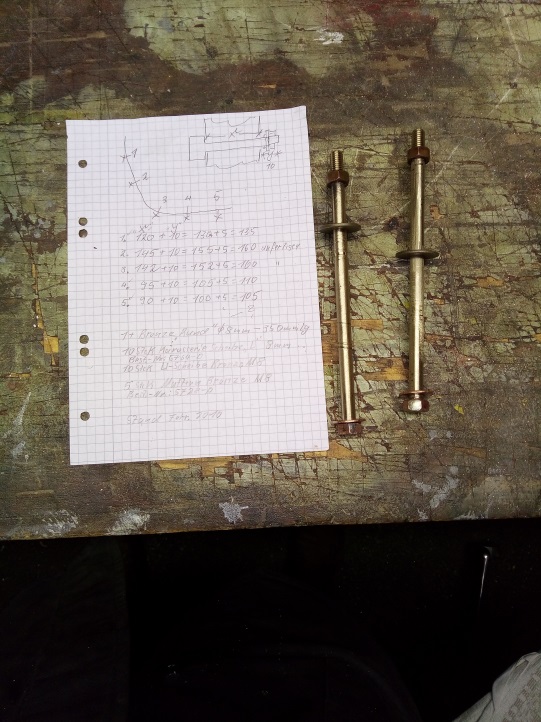 Rundmaterial, Muttern und Scheiben von Dauelsberg eingetroffen. Unterlegscheiben nicht in Bronze, sondern in Kupfer geliefert, Ø19 mm entspricht nicht DIN. Sacklöcher haben wir in Ø 16mm ausgeführt entsprechend der DIN. Die 5 Sacklöcher müssen auf Ø 20 mm aufgebohrt werden.