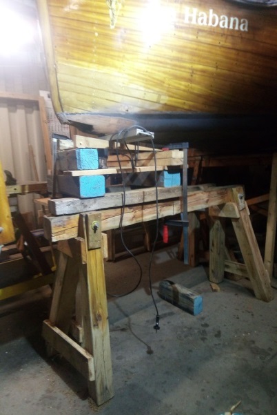 Vorrichtung unter dem Bug von „La Habana“ aus Böcken errichtet um über Kopf mit der Einhandfräse die Schadstelle ab zu fräsen. Schäftung ca.320mm lang (lg), Breite entsprechend der Kielbohle. (Nicht 1:10 = 380mm lg)