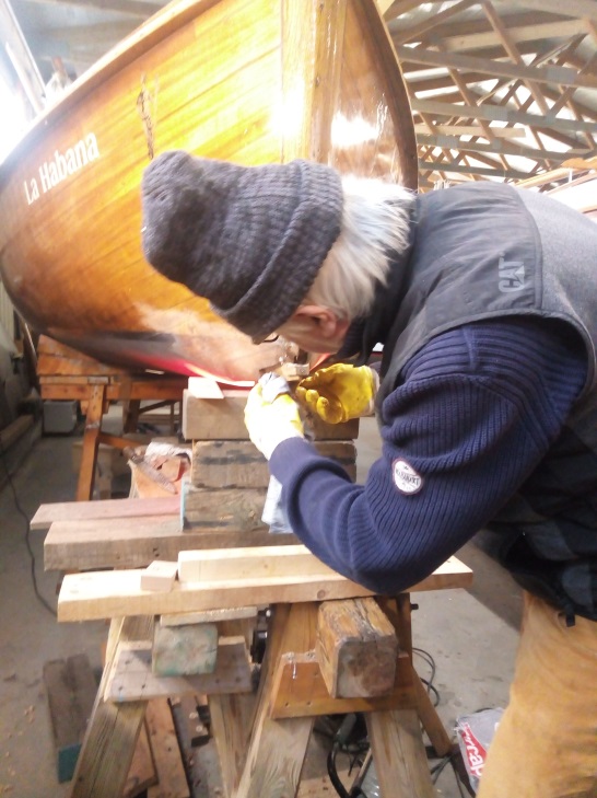 Spund angefertigt „Einsatzstück“ zwischen Steven und der Kielbohle (war rott). Wird mit der Doppelung, die auf der Innenseite bereits montiert/geklebt wurde, eingepasst und verklebt