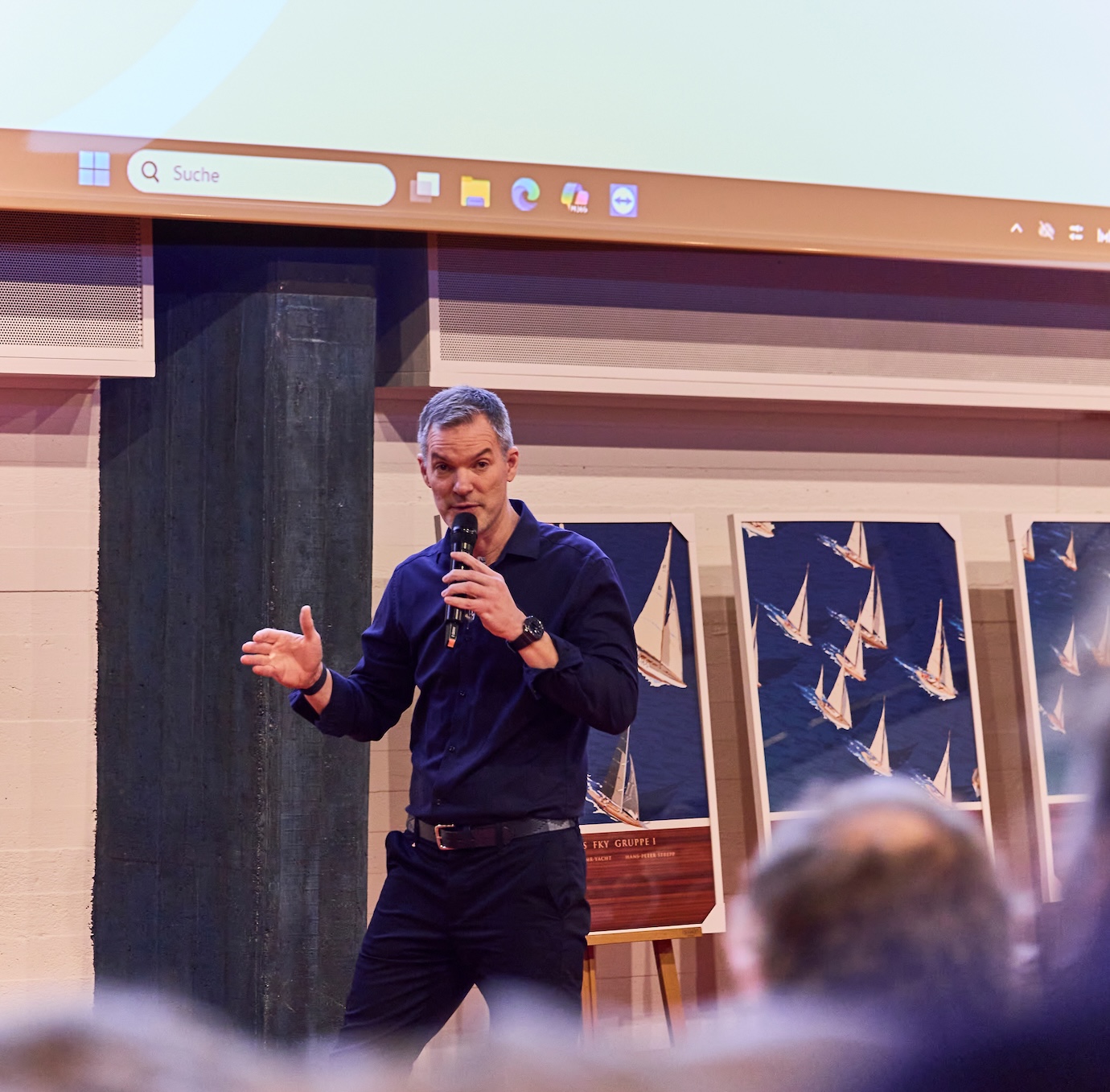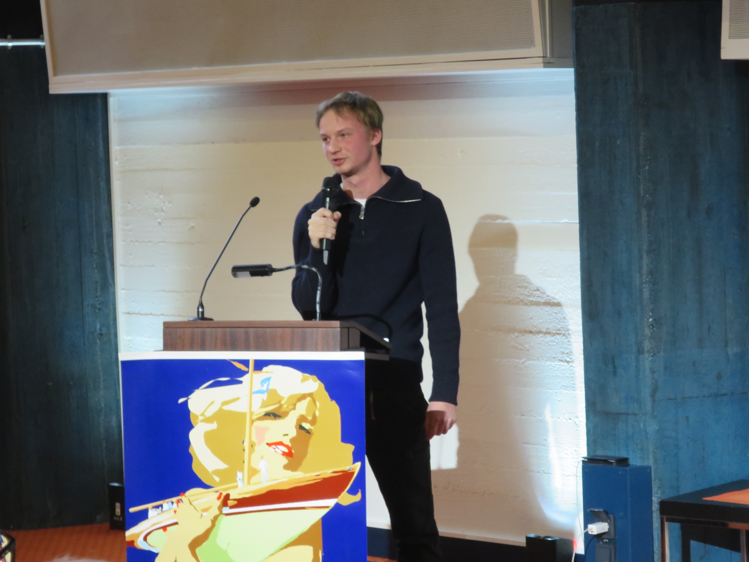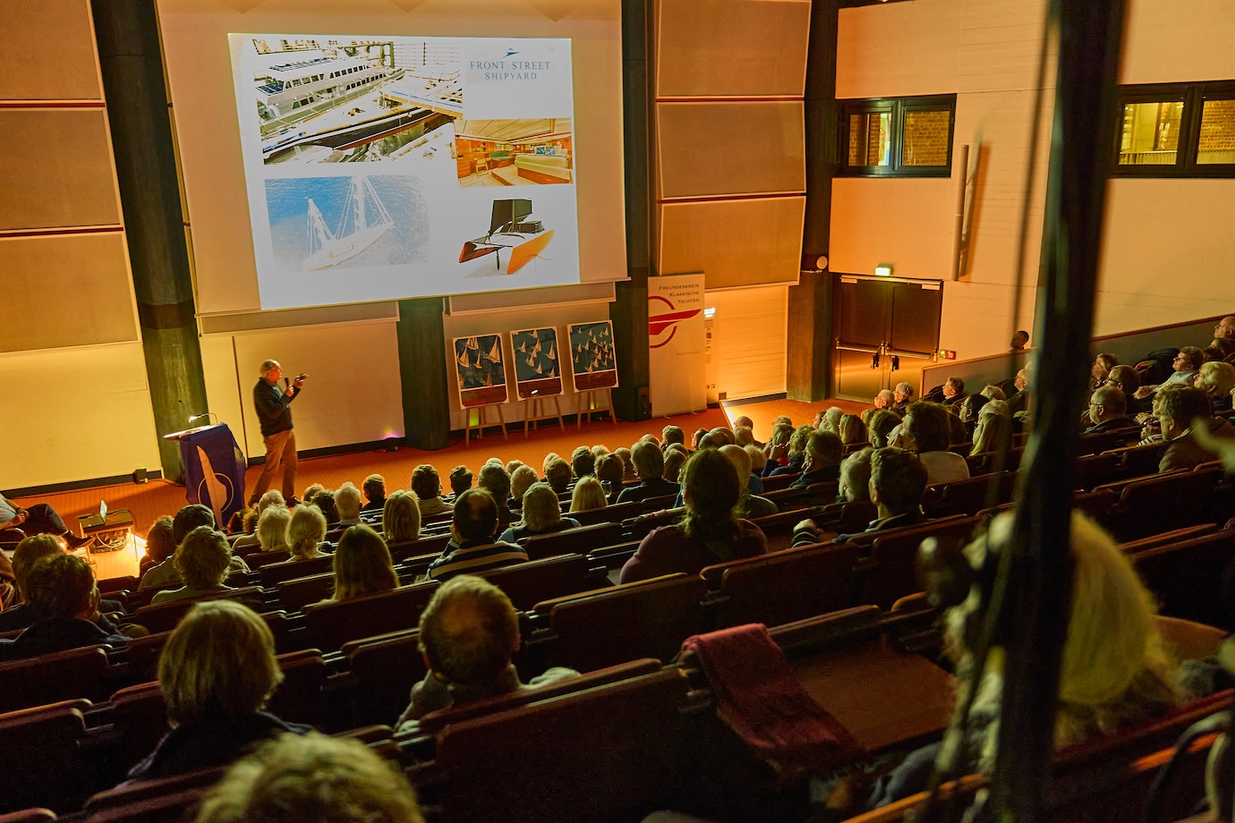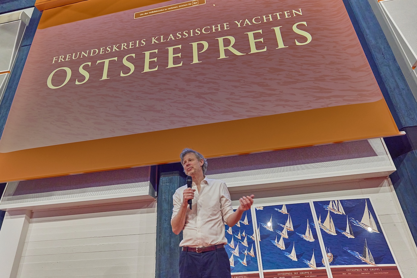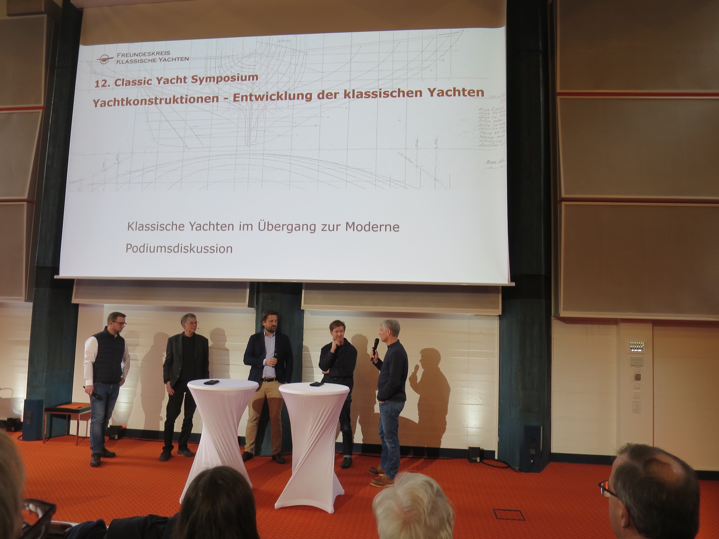 Pünktlich um 11:00 eröffneten Niko von Bosse und Martin Mohrmann das Symposium und mit Matthäus Schwaderlapp vom Ingenieurbüro Detlev Löll betrat gleich ein echter Fachmann die Bühne. Matthäus führte uns durch die Entwicklung der Yachten vom Beginn des 20. Jahrhunderts bis in die 70er Jahre, vor allem bezogen auf die Unterwasserschiffe, vom Langkieler zum geteilten Lateralplan und das Verhalten im Seegang dargestellt an den Yachten KERSTIN III von Niklas von Meyerinck und ANAïS von Michael Specht, beide vor Ort. Eigentlich Spezialist für Riggs vor allem auf Großseglern konnte er auch dieses Thema gut verständlich für alle rüberbringen.