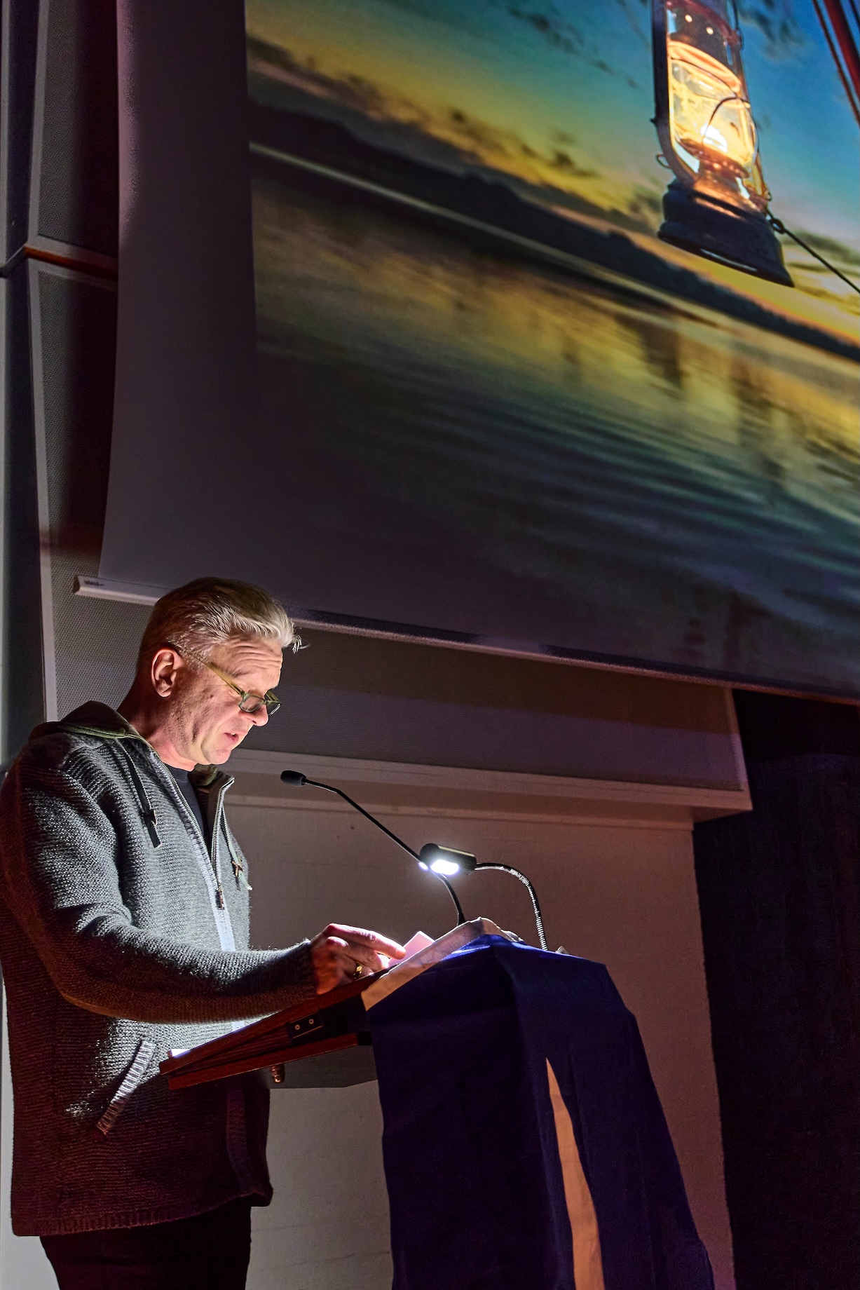 Mit einem stimmungsvollen musikalisch unterlegten Film (Winter im norwegischen Hafen) eröffnet Jan Lohrengel pünktlich den Abend.