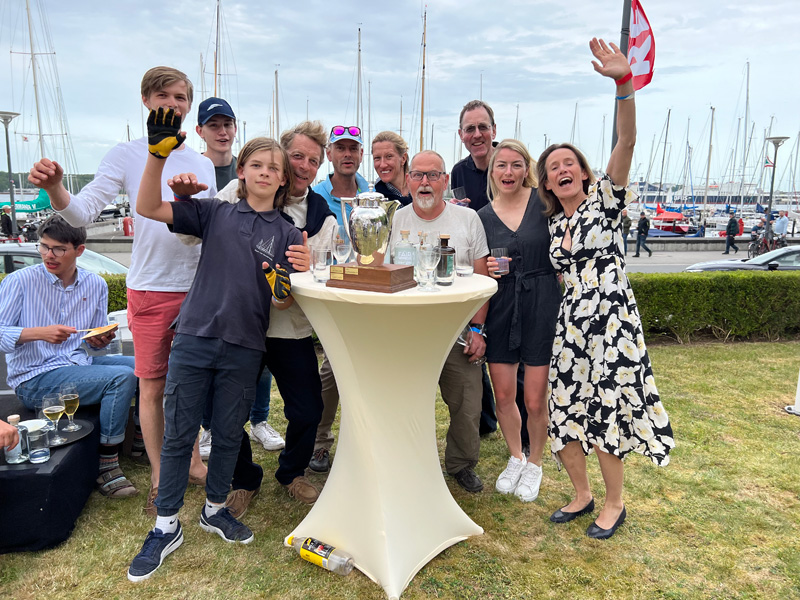 Nach einer ruhigen Nacht am Anker im Plüschowhafen gab es am Samstagmorgen bei herrlichstem Sonnenschein und Badewetter frische Brötchen für die Teilnehmer per Gummiboot. Der Wetterbericht versprach beste Segelbedingungen bei westlichen Winden bis 16 Knoten. Und so kämpften 45 klassische Schmuckstücke auf 2 Bahnen und in 4 Startgruppen bei kaiserlichem Wetter um die besten Plätze. Nach dem Ende der Wettfahrten gab es bei Kaffee und Kuchen das „Rendezvous der Klassiker“ im Becken 4 vor dem KYC-Hotel. Die neuen Betreiber des nach langjähriger Pause endlich wieder geöffneten Hotels hatten es ermöglicht, dass die Preisverteilung auf dem Rasen vor dem Hotel stattfinden konnte. Dirck Hilken verlieh die Preise an die Gewinner der Wettfahrten. Und passend zum Motto der „Classic Week light“ überraschte er mit einem Sonderpreis für die Yachten, die an allen Rennen aus den Veranstaltungen „The Run“ und „Rendezvous“ teilgenommen hatten. Immerhin 15 Schiffe konnten sich über eine Flasche feinstem „Fair Winds Pantaenius Gin“ freuen. Dr. Martin Lutz verlieh dann im Namen des KYC den Berthold Beitz-Cup in Form der kaiserlichen Kanne für die schnellste große Kreuzeryacht. Nachdem dieser Preis erstmalig 2019 von der Königin, dann 2020 von der Mingary und 2021 von der Germania VI gewonnen wurde, konnte in diesem Jahr die Crew des Peter von Seestermühe die mit Gin Tonic gefüllte Silberkanne lenzen. Nach der Preisverleihung gab es für 145 hungrige Mägen Currywurst und veganes Curry vom Buffet des Hotels und nette Gespräche bei kühlen Getränken und lauem Sommerwetter.