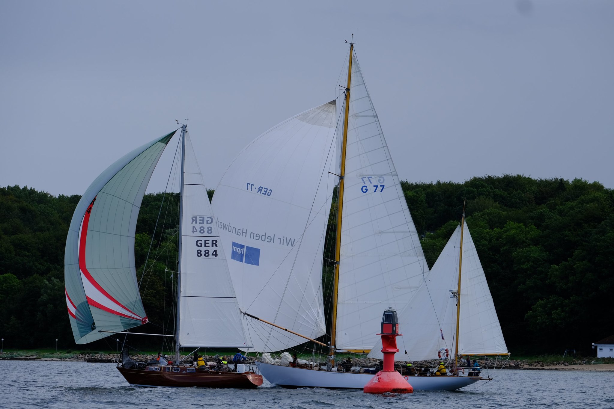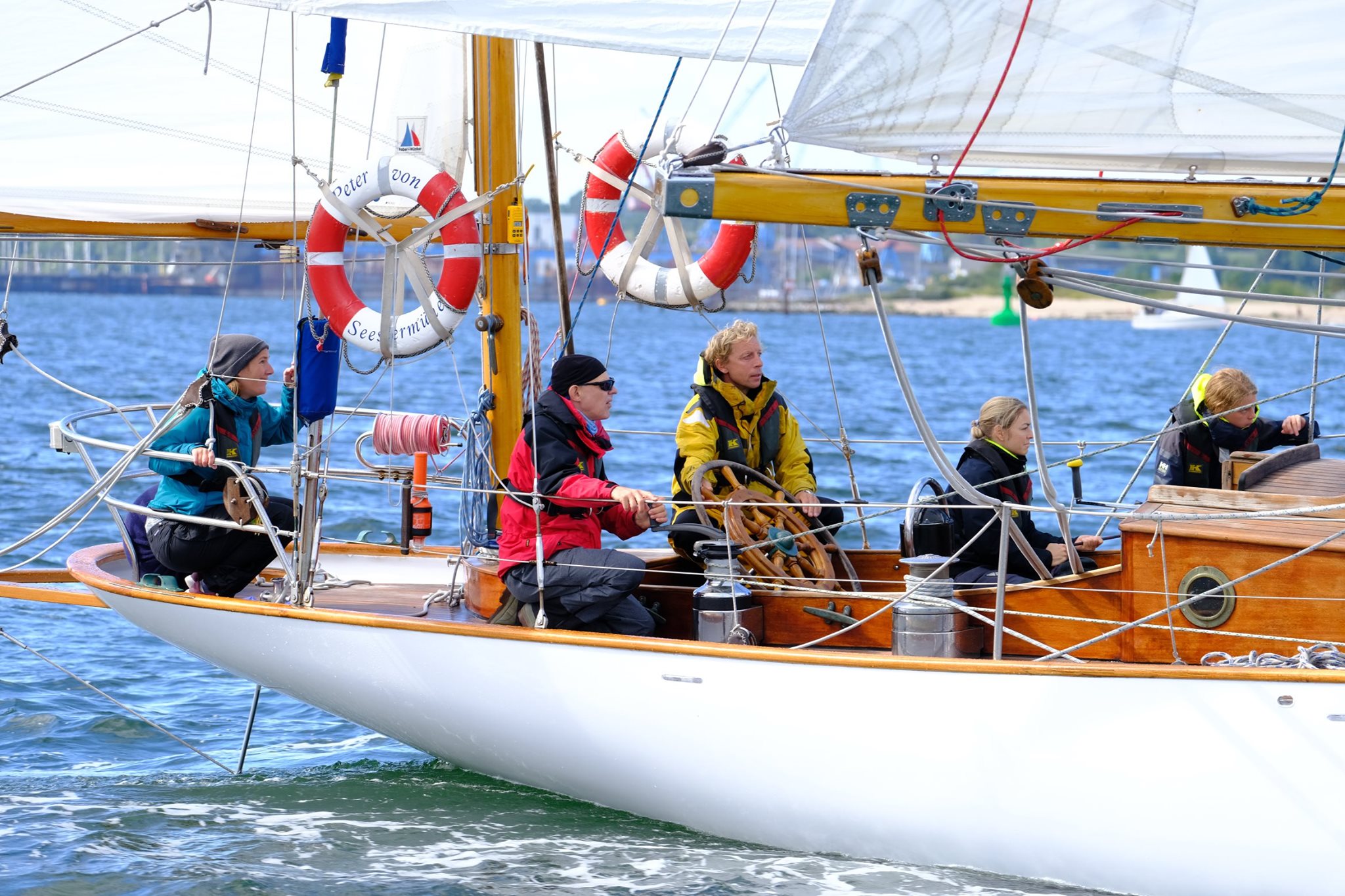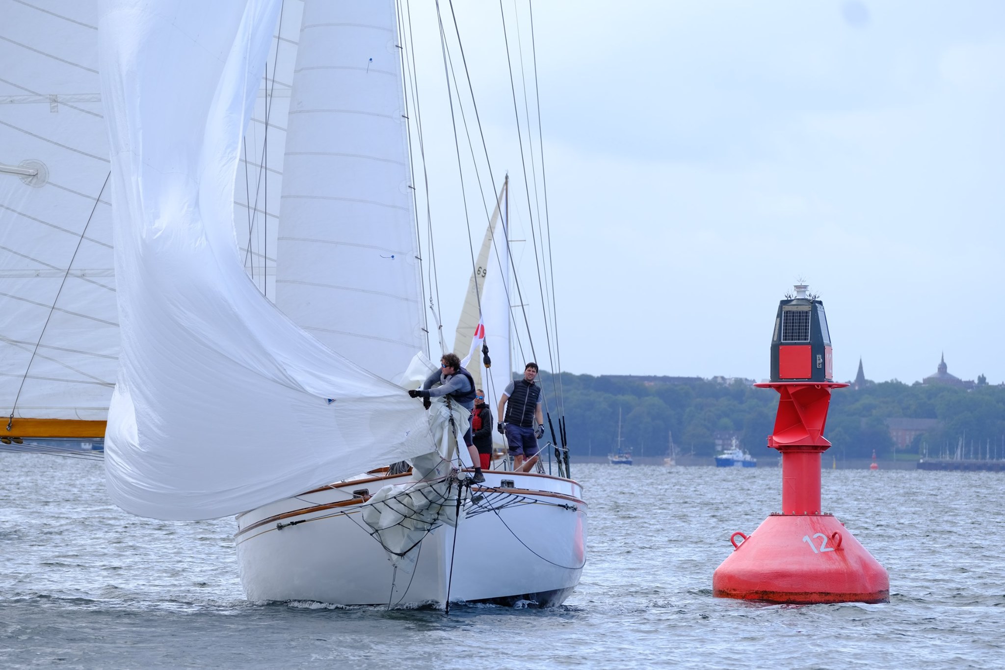 Die Freude war also groß und den Seglern auf den 45 teilnehmenden Klassikern deutlich anzusehen. Die Crews auf den großen Yachten hatten Richtung Leuchtturm und zurück den optimalen Kurs zu finden, die auf den kleineren Booten hatten auf der Innenförde mit den Winddrehern zu kämpfen.