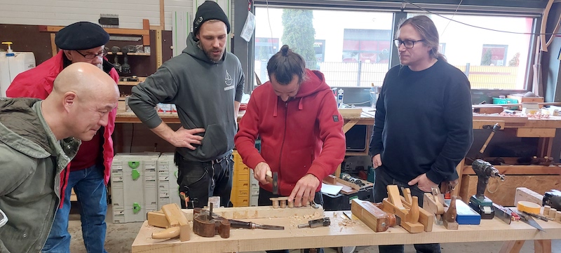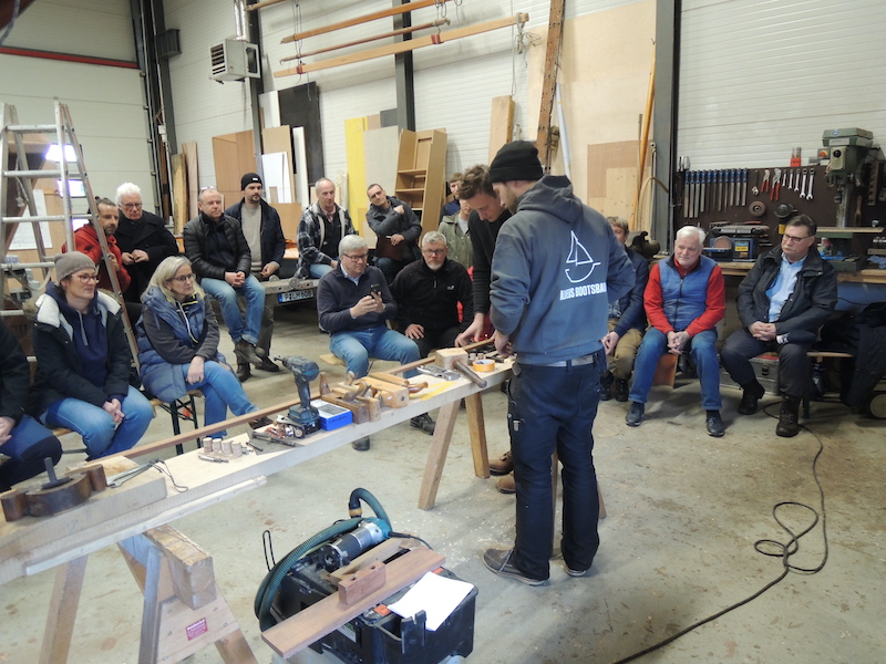Fragen aus dem Teilnehmerfeld wurden mit viel Geduld und geballtem Fachwissen beantwortet. Ein kleiner Imbiss konnte von den Teilnehmern und den Bootsbauern für interessante Fachgespräche und Erfahrungsaustausch genutzt werden. Anschließend ging es um das Ausspunden von Fehlstellen, Verpropfen von Schraubenlöchern und das sichere Bedienen von Oberfräse und Schleifstein genauso wie das richtige Verkleben mit Epoxy oder das Dämpfen von Spanten. Immer wieder wurden typische Werkzeuge und ihre Handhabung gezeigt, auch das Erkennen von Schadstellen wurde ausführlich besprochen.