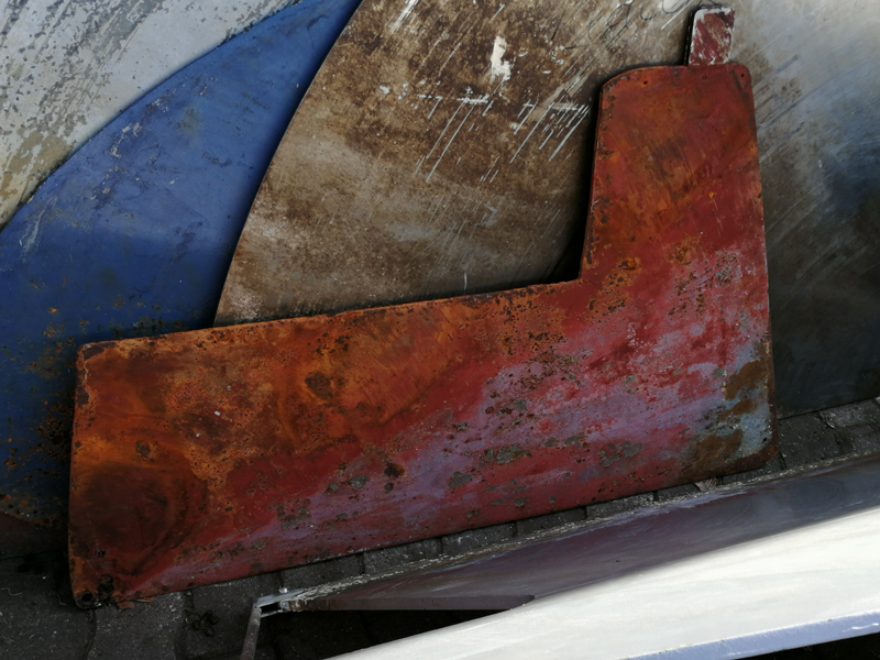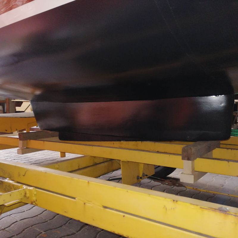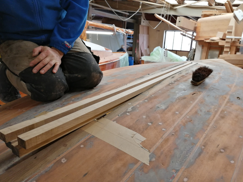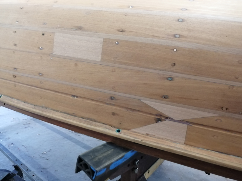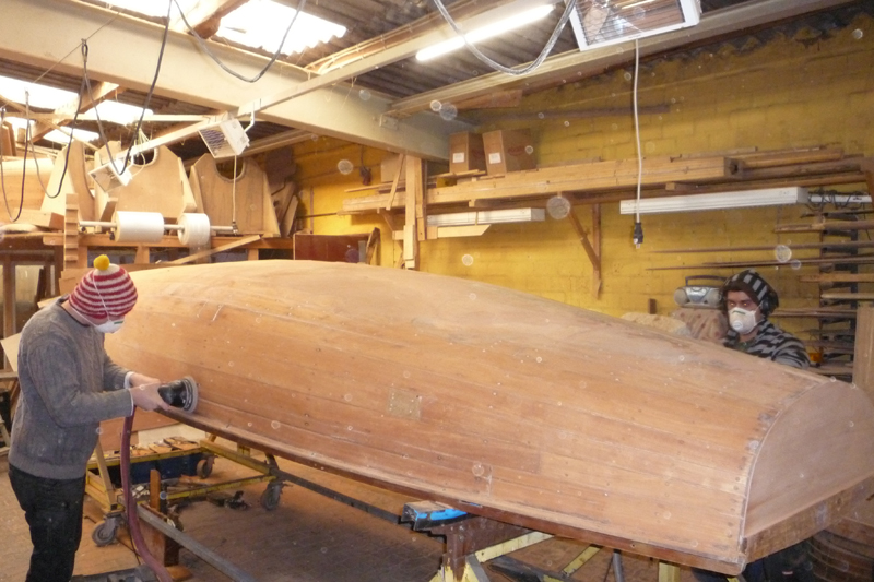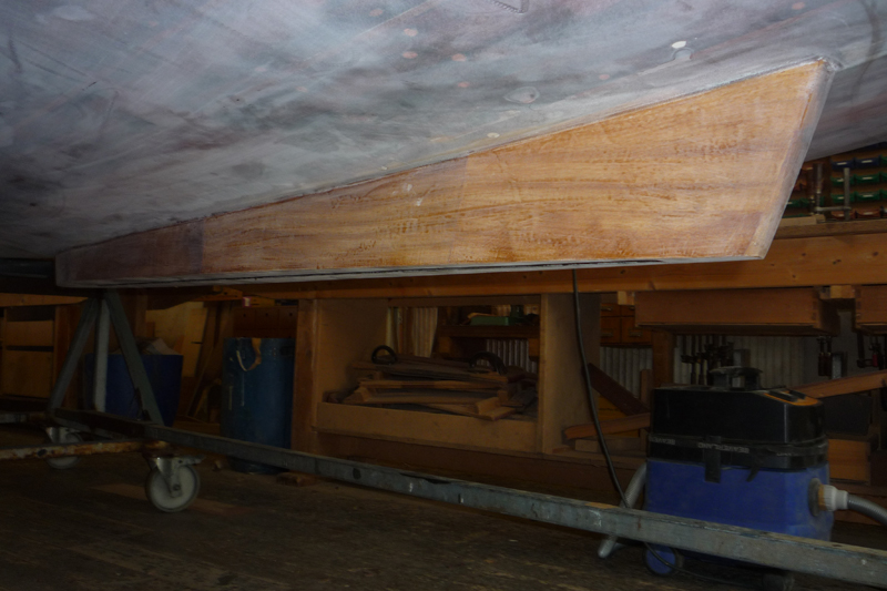 Das Schwert und der Eisenballast wurden bei einer Zulieferfirma gereinigt, gesandstrahlt und konserviert. Dabei musste der Ballastteil noch wegen der Teerkonterminierung einer besonderen Behandlung unterzogen werden. Im hinteren Bereich des Unterwasserschiffs war eine größere Delle, diese entstand wohl durch früher unsachgemäße Lagerung des Bootes. Diese Stelle wurde durch ein aufgeleimtes Furnierholz etwas ausgeglichen. Auch an einigen Stellen der Außenhautbeplankung mussten diese ausgearbeitet und Passstücke aus Mahagoni eingesetzt werden. Wie schon mehrfach wurde auch jetzt wieder geschliffen und geschliffen.
