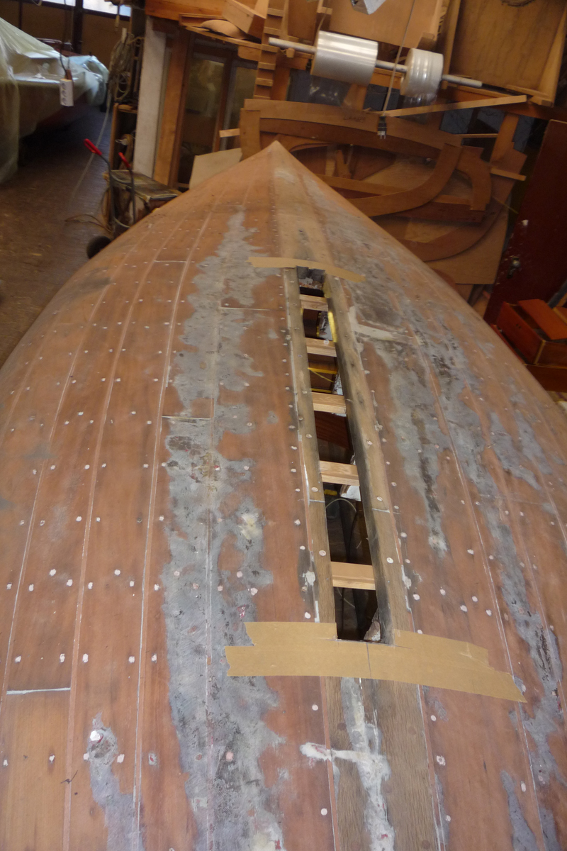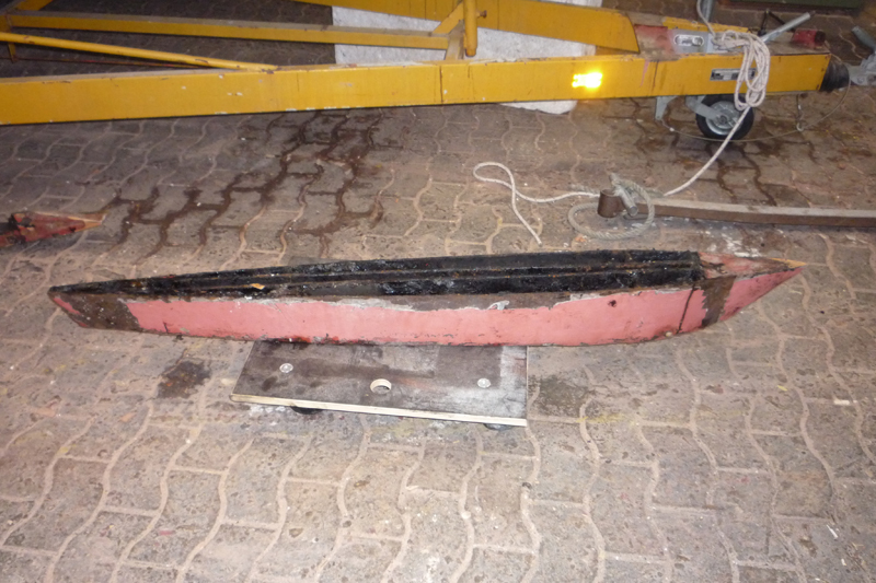 Nach gründlicher Bestandsaufnahme erfolgte als Erstes die totale aufwendige Entfernung der alten Versiegelung und Lackierung der Außenhaut und des Unterwasserschiffes mit Exenter-Schleifmaschinen. Da ja auch Kiel und Schwertkastenunterteil marode waren, wurden hier die Bolzen gezogen und die Teile als Muster zur Seite gestellt. Die Kielbolzen können weiter verwendet werden, das Holz allerdings war nicht mehr zu gebrauchen. Als sich der Eisenballast löste, quoll dicker Teer aus den Hohlräumen. Es stellte sich dabei heraus, dass dieses Teil nicht wie üblich aus Gusseisen gefertigt, sondern geschweißt war. Das Oberteil des Schwertkastens schien wiederverwendbar und dieses wollte die Werft am Ende wieder aufsetzen. Um den jetzt frei liegenden Schwertschlitz an der Kielplanke zu stabilisieren, wurden innen Klaspen quer zwischen den Bodenwrangen befestigt. Der Schlitz wurde dann sauber ausgefräst und durch eingeleimte Leisten aus Eiche auf Sollbreite gebracht.