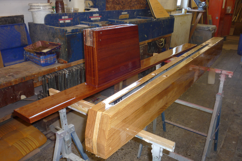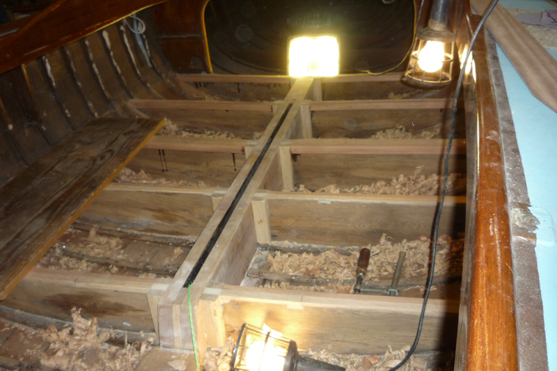 Um später Probleme zu vermeiden, wurden Kiel, Totholz und der untere Teil des Schwertkastens zusammengesetzt und entsprechend der Löcher im Ballastteil gebohrt. So brauchte man später die Teile nur noch einbauen und verschrauben. Jetzt wurde noch das Totholzteil auf der Kielplanke befestigt und das Boot konnte umgedreht und so für die Innensanierung und Einbauten leichter bearbeitet werden. Die Bodenwrangen wurden dann noch abgeputzt, teilweise verstärkt und ausgeglichen, so dass die Bodenbretter plan aufliegen können. Zuletzt musste noch die neue Abdeckbohle zusammen mit dem Schwertkasten-Oberteil aufgesetzt werden.