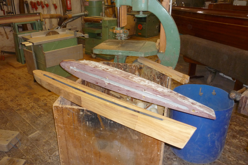 Inzwischen waren Schwert und Ballastteil zurück, und so konnte nun nach altem Muster mit dem Verleimen des Totholzes begonnen werden. Im Ballastteil wurden innen die Leerräume mit Hartholz gefüllt und mit Epoxy ausgegossen, außenherum mehrfach gespachtelt. Die vorbereiteten Planken für den unteren Schwerkasten und vom Totholz wurden von innen mit Graphit angedicktem Epoxy versiegelt. Also alles Materialien die früheren Bootsbauern nicht zur Verfügung standen!