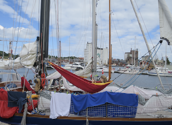 Kein Menu diesmal im Guldsaal, stattdessen Backfisch aus der Friteuse oder Spaghetti an Bord. Den Klassikerfreunden hat’s gefallen. Bis zum Sonnenuntergang genossen es Vera mit dem E-Piano und Jens mit dem Sax sichtlich, endlich mal wieder vor einem kleinen Publikum zu spielen. Die beiden dänischen Girls im Eiswagen sorgten für leckeren Nachtisch und in manchen Cockpits gingen die Partys wohl bis nach Mitternacht.