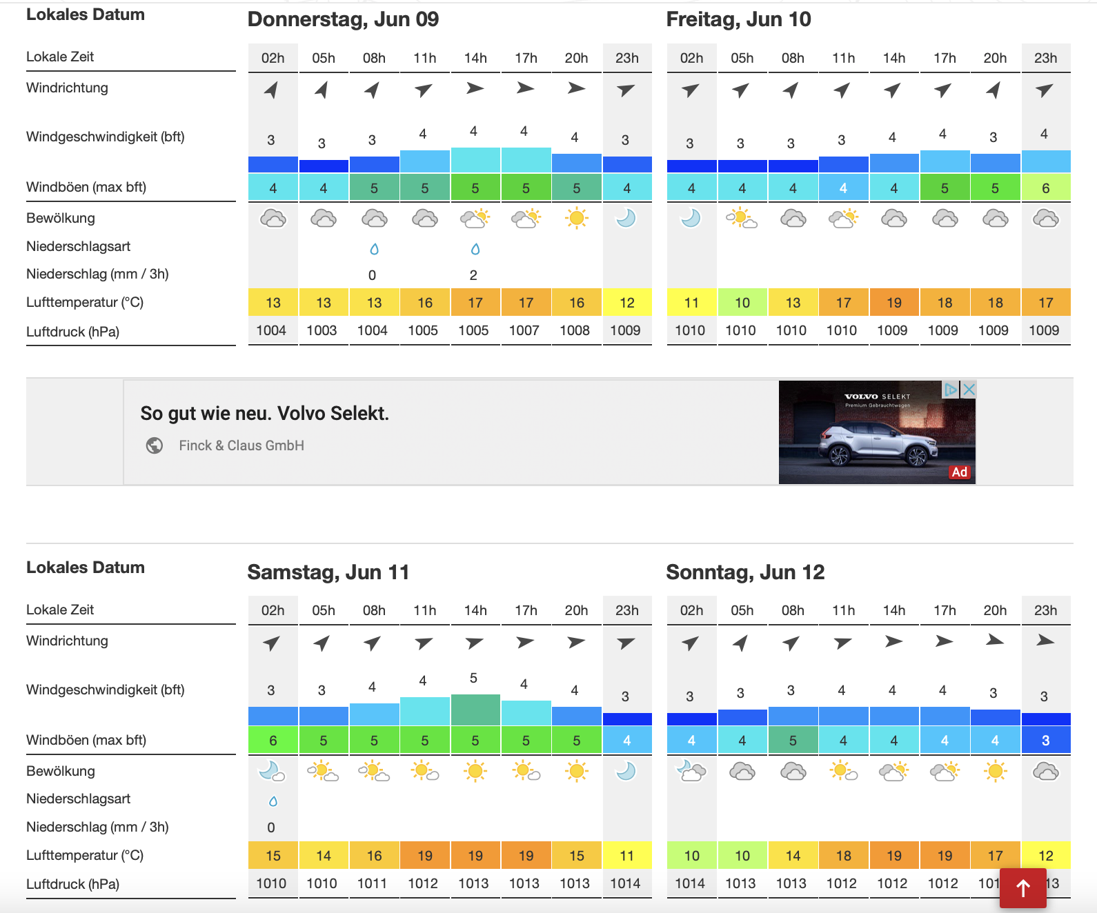 "Windfinder" wagt eine Vorhersage. Sie verheißt (am 5.6.) gute Bedingungen!