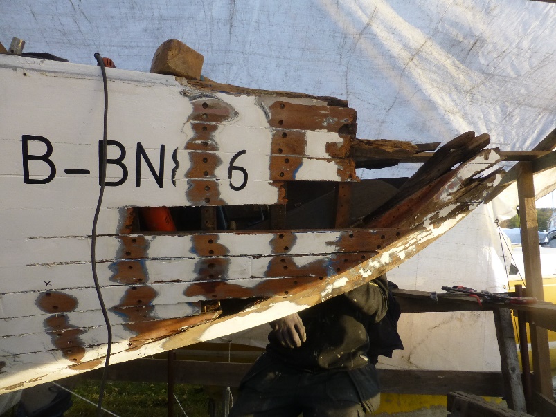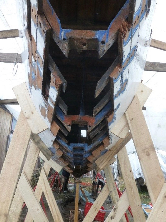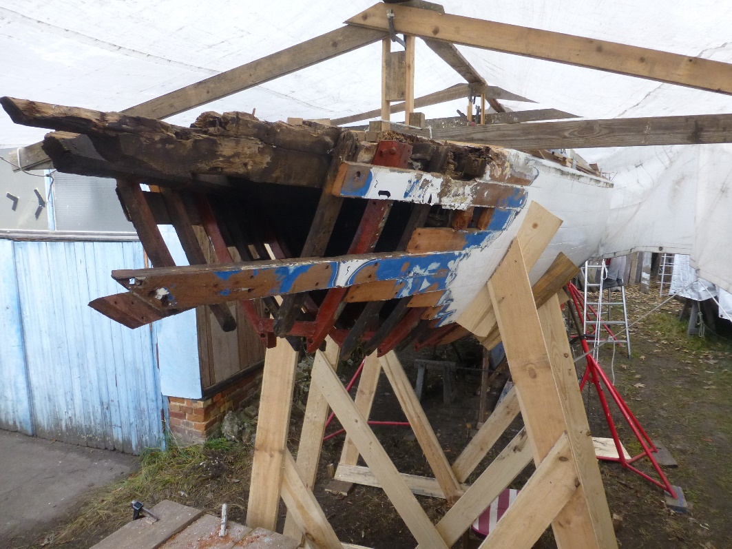 Aktuell werden erneuert: Vordersteven anschließender Kielbalken bis Totholz unter der Mastspur, einige Holzspanten, Reparatur der Stahlbodenwrangen im Bilgebereich, Stahlspanten, Anschäften der Planken.