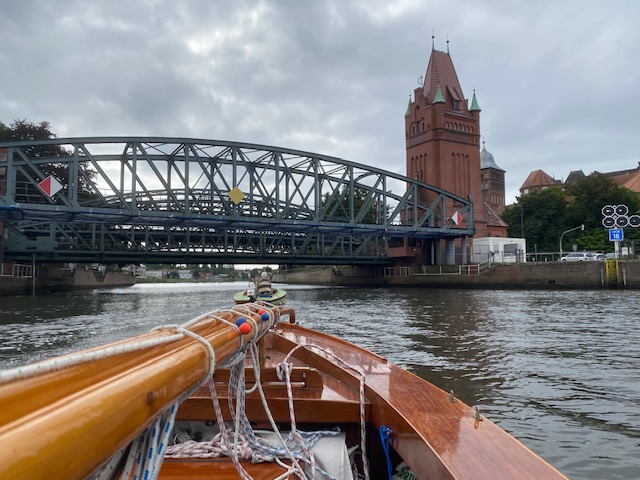 Unsere Zeit neigt sich dem Ende und wir setzten den Gedanken, mit gelegtem Mast um Lübeck herum zu fahren, fest. Toller Abschluss. Bis in die nächtliche Dunkelheit segelten wir die Trave hoch zur Teerhofinsel und legten uns erfüllt zur Nacht. Des anderen Tags Mast legen und mit AB Richtung Stadt. Bei bestem Wetter machten wir im Museumshafen fest, um zu Fuß die Stadt zu besuchen. Zurück im lauten Trubel der Stadt als Wiedereinstieg ins normalen Leben war das eine gute Idee. Gegen 17.00h war der Krantermin im SVT, zu dem wir rechtzeitig erschienen. Die Boote auf die Trailer und ein Abschied mit Glück im Herzen, aber auch mit Wehmut ein Jahr zu warten, um 2022 im Juli die Flensburger Förde zu besegeln. Ich bin sehr glücklich, dass ich diese tollen Männer ins Boot gekriegt habe, die sich alle mit Mut und Willen diesem Abenteuer hin gegeben haben, und ich mit denen ein Stück gewachsen bin.