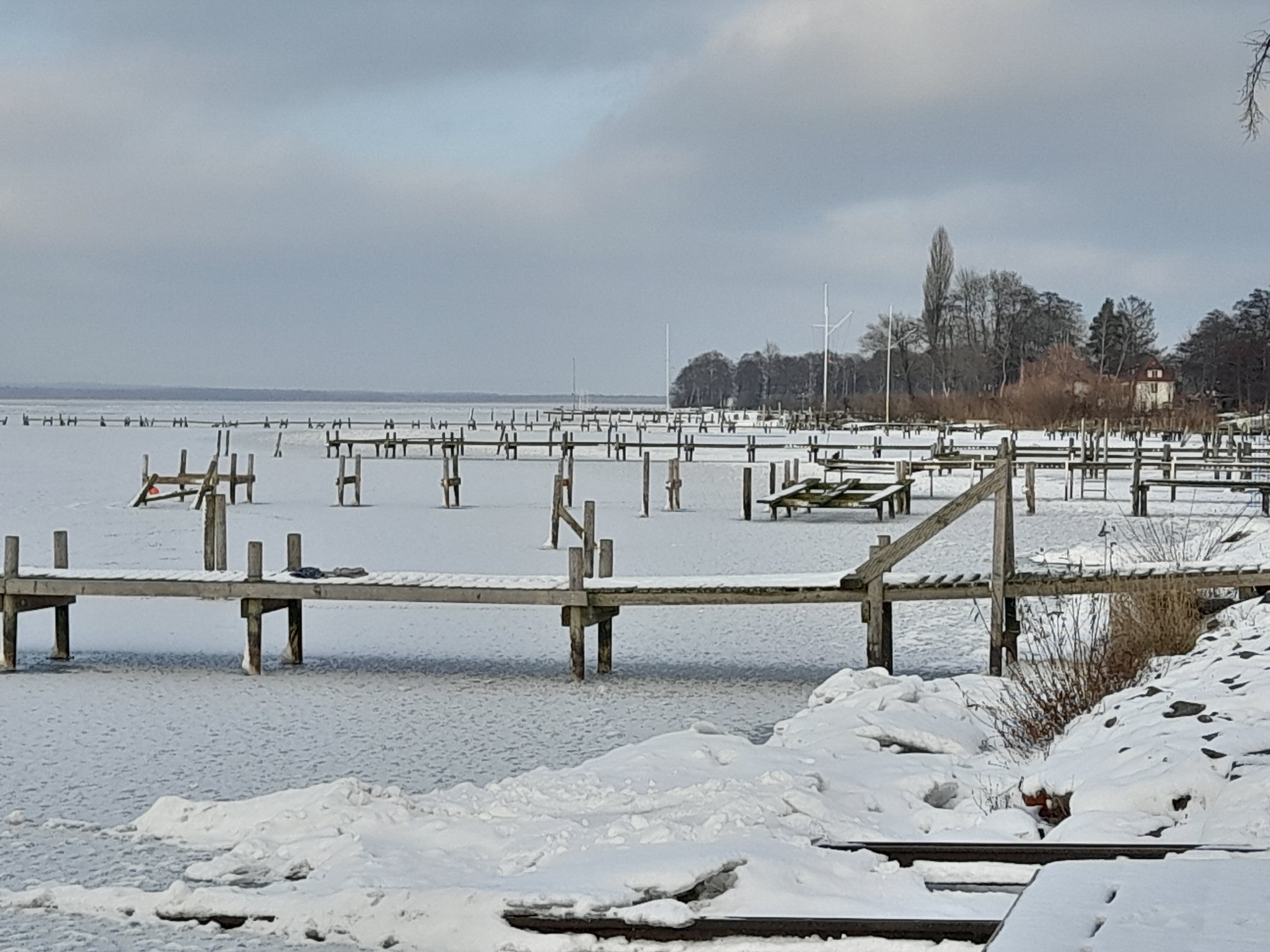 Der Winter mit Eis und Schnee hat das Steinhuder Meer fest im Griff. Für Eissegeln ist das Eis noch nicht dick genug und der Schnee würde das Gleiten stark behindern.