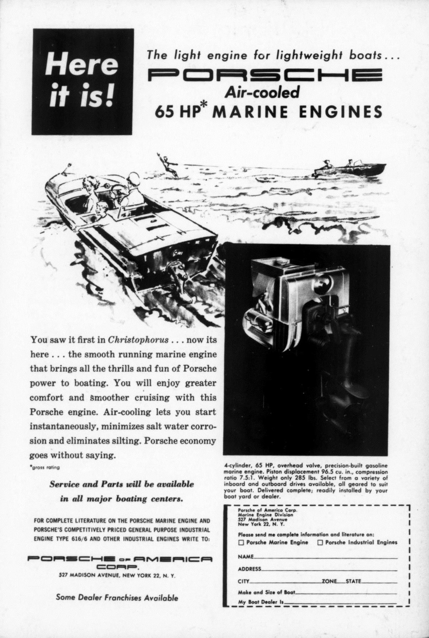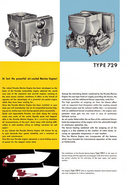 Vornehmlich für den US-Markt stellte das Unternehmen 1959 den 52 PS (38 kW) starken „729“ vor. „Schnell und zuverlässig jagen Porsche-Wagen über alle Rennpisten und Straßen der Welt. Schnell und zuverlässig ist auch der Porsche- Bootsmotor“, warb Porsche damals für den Antrieb.
