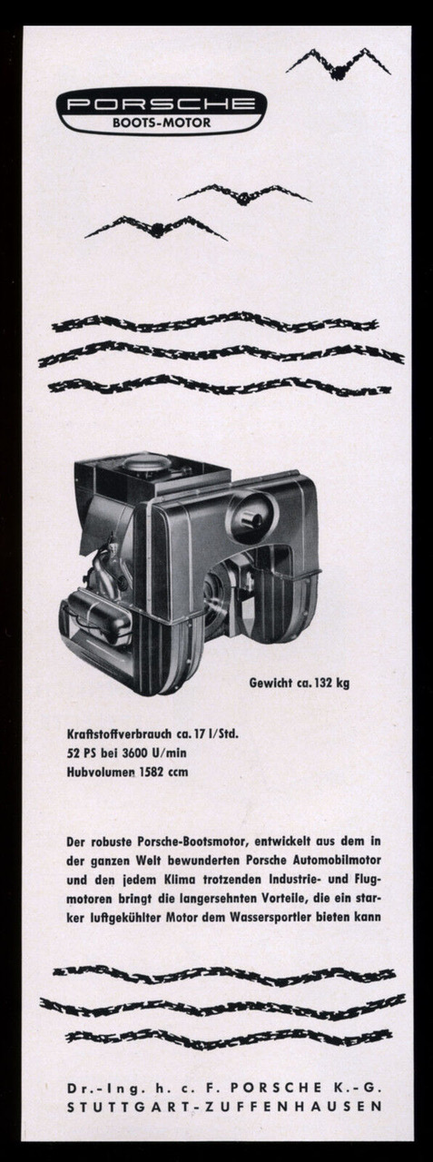 Ferry Porsche, Vater des legendären Porsche 356, entwickelte aus dem 1,6-Liter-Vierzylindermotor bereits in den 50er Jahren ein leichten, kraftvollen Bootsmotor. Und zwar Porsche-typisch luftgekühlt!