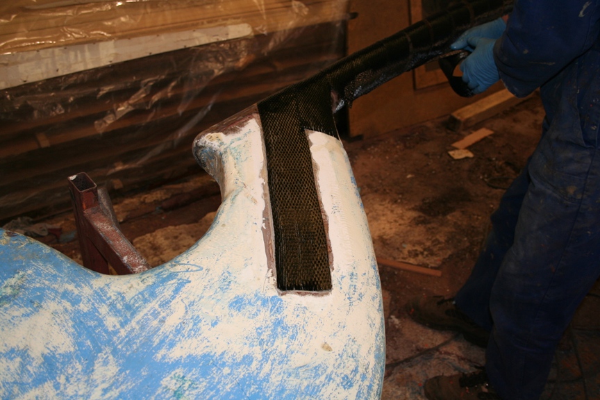 Die Ruderpinne war noch so gut, dass nach Entfernen von Pulverholz und Verstärkung mit Karbon materiell die ganze Konstruktion jetzt stärker ist als zuvor.